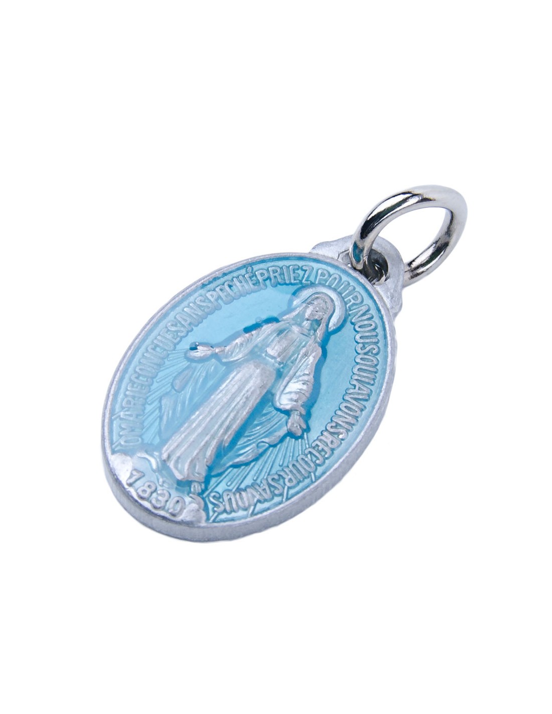 Medaille aus Metall und emailliert in einem schönen Hellblau, mit dem Bildnis der wundertätigen Jungfrau auf der Vorderseite und dem marianischen Symbol auf der Rückseite. Es ist ein dezentes und anspruchsvolles Schmuckstück mit der Symbolik von Schutz und bedingungsloser Liebe.