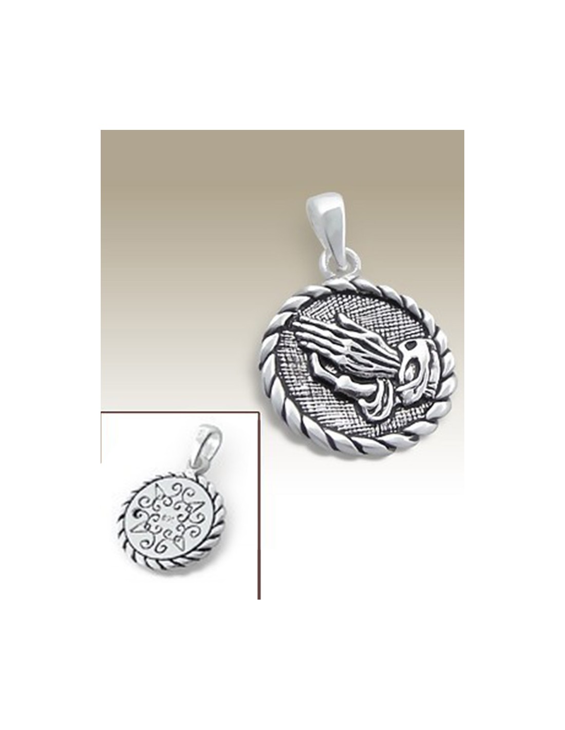 Anhänger aus echtem Silber 925. In Form eines Kreises mit einem geflochtenen Rand und betenden Händen in der Mitte. Eine fein geschnitzte Medaille.