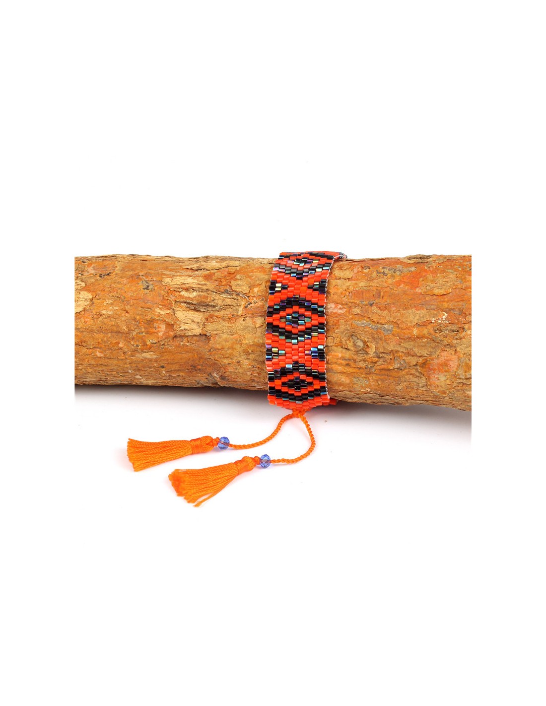 Breites Armband aus Perlen, die zu geometrischen Mustern geflochten sind, mit Quasten in den Farben der Perlen. Ein zartes und elegantes Accessoire, perfekt um Ihrem Outfit einen Hauch von Chic zu verleihen!