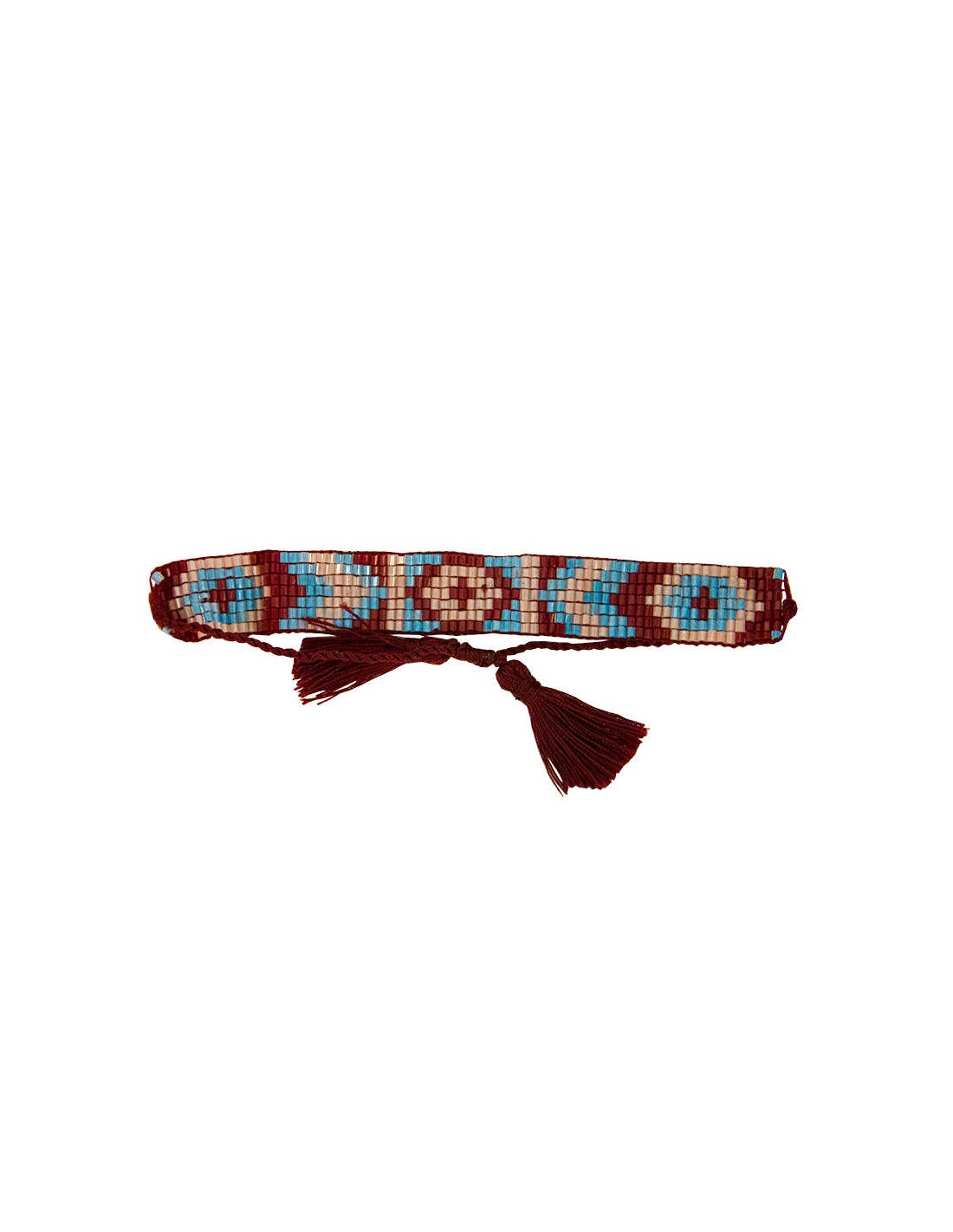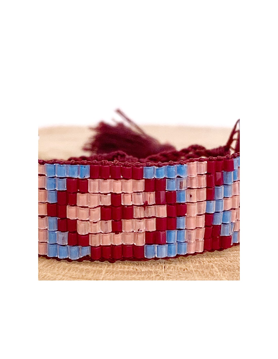 Breites Armband aus Perlen, die zu geometrischen Mustern geflochten sind, mit Quasten in den Farben der Perlen. Ein zartes und elegantes Accessoire, perfekt um Ihrem Outfit einen Hauch von Chic zu verleihen!