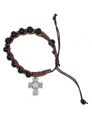 Armband aus braunem Leder mit schwarzen Holzperlen, verziert mit einem Kreuz der Heiligen Beschützer aus versilbertem Metall. Das Juwel kann auch als Zehner verwendet werden.