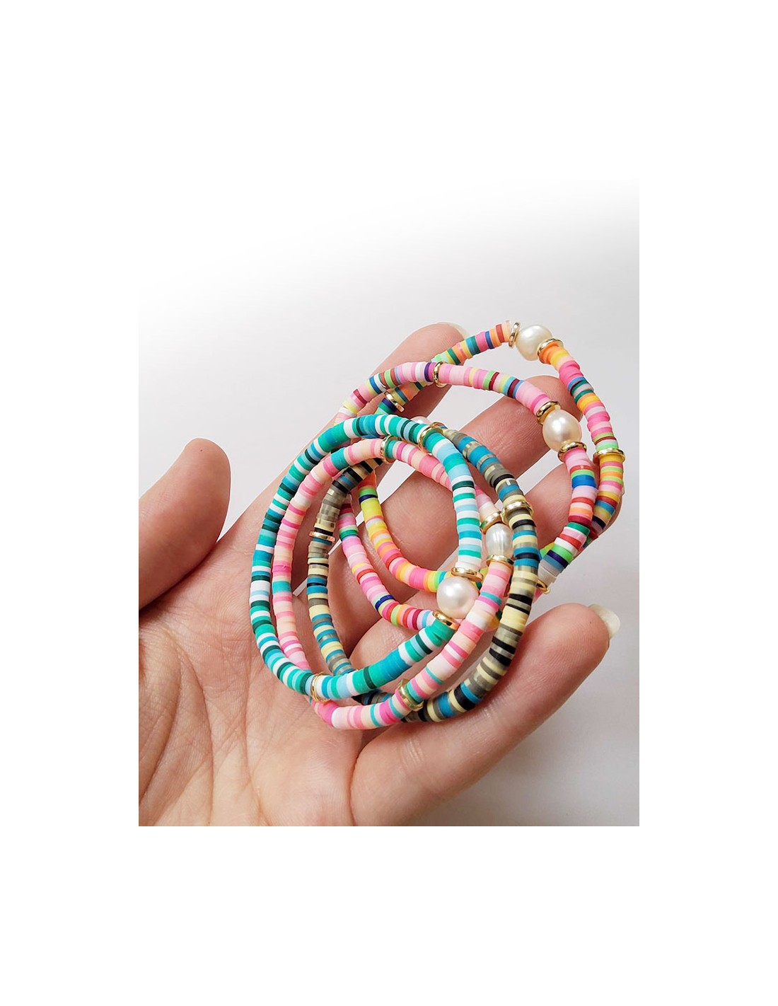 Hübsches Bohemian-Armband in Neonrosatönen, das an eine köstliche Zuckerwatte erinnert. Von Kunsthandwerkern handgefertigt, besteht es aus kleinen Polymertonsegmenten und ist mit vier goldenen Perlen und einer Süßwasserperle verziert, deren perlmuttartiges Weiß perfekt mit der mehrfarbigen Mischung des Armbands harmoniert.