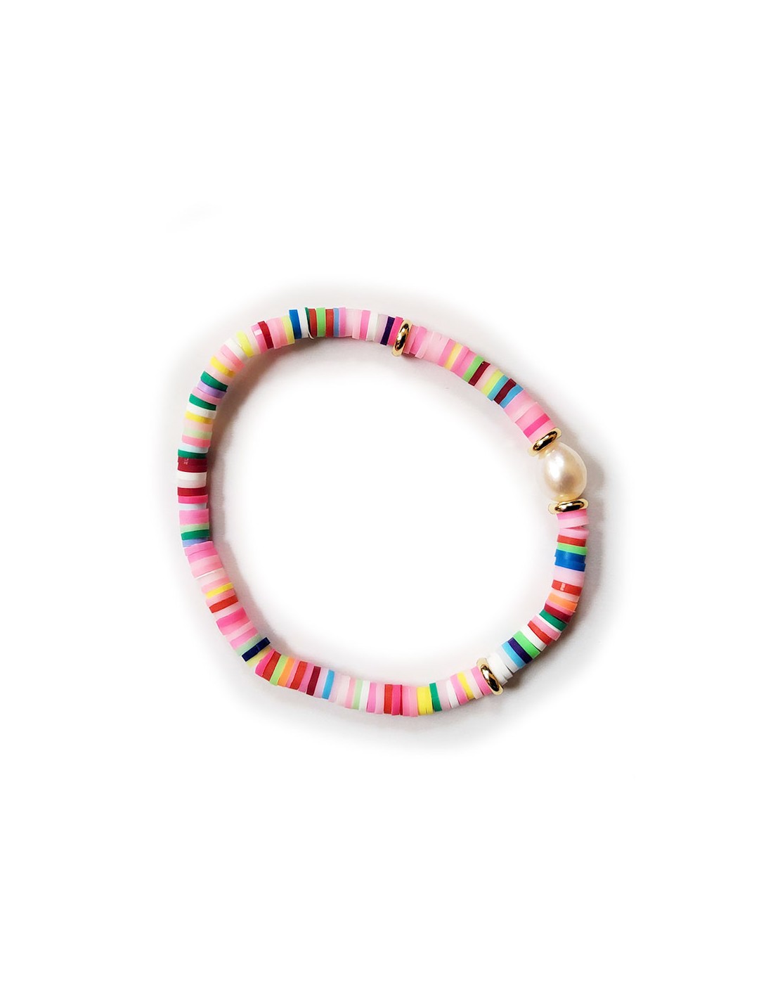 Hübsches Bohemian-Armband in leuchtenden, mehrfarbigen Farben. Von Kunsthandwerkern handgefertigt, besteht es aus kleinen Polymertonsegmenten und ist mit vier goldenen Perlen und einer Süßwasserperle verziert, deren perlmuttartiges Weiß perfekt mit der mehrfarbigen Mischung des Armbands harmoniert.