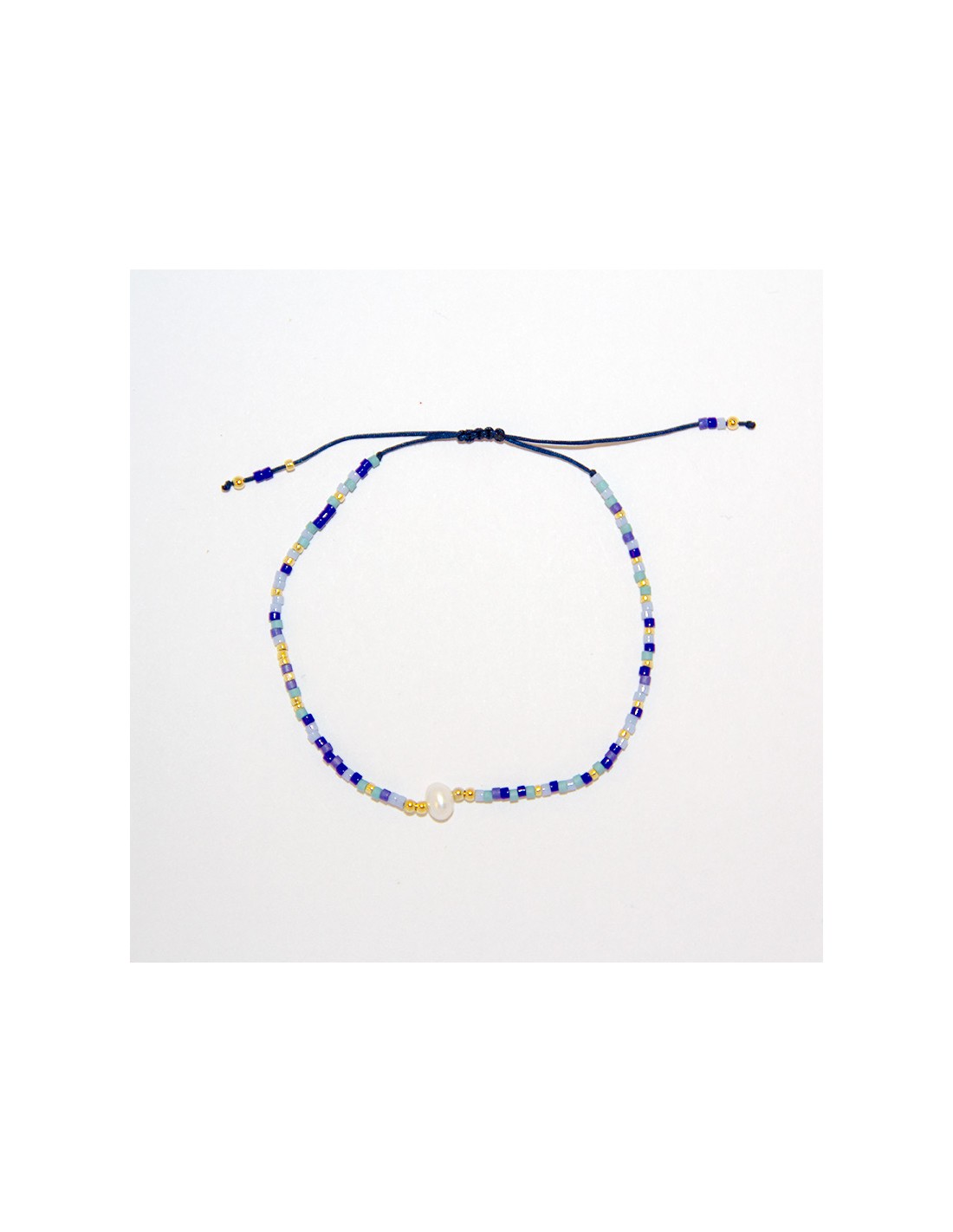 Dieses zarte und feine Armband ist in der Mitte mit einer echten Perlmuttperle geschmückt, die ihrerseits von goldenen Perlen umringt ist, die sie hervorheben. Weitere goldene Perlen zieren elegant den Faden des Armbands und seine Enden wie leuchtende Akzente, die das Ganze erhellen. Der Makramee-Knoten greift die Perlmuttperle auf, und die fliegenden Fäden mit vier Perlen sorgen für eine leichte und subtile Note.