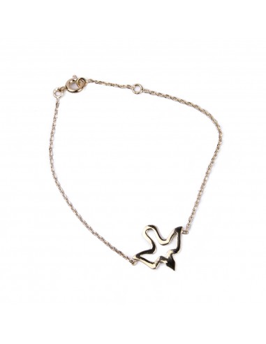 Vergoldetes Armband mit einer Taube. Der Anhänger stellt die zarte Silhouette des Vogels im Flug dar. Ein ästhetisches und böhmisches Juwel. Der Karabinerhaken hat zwei Schließpositionen.
