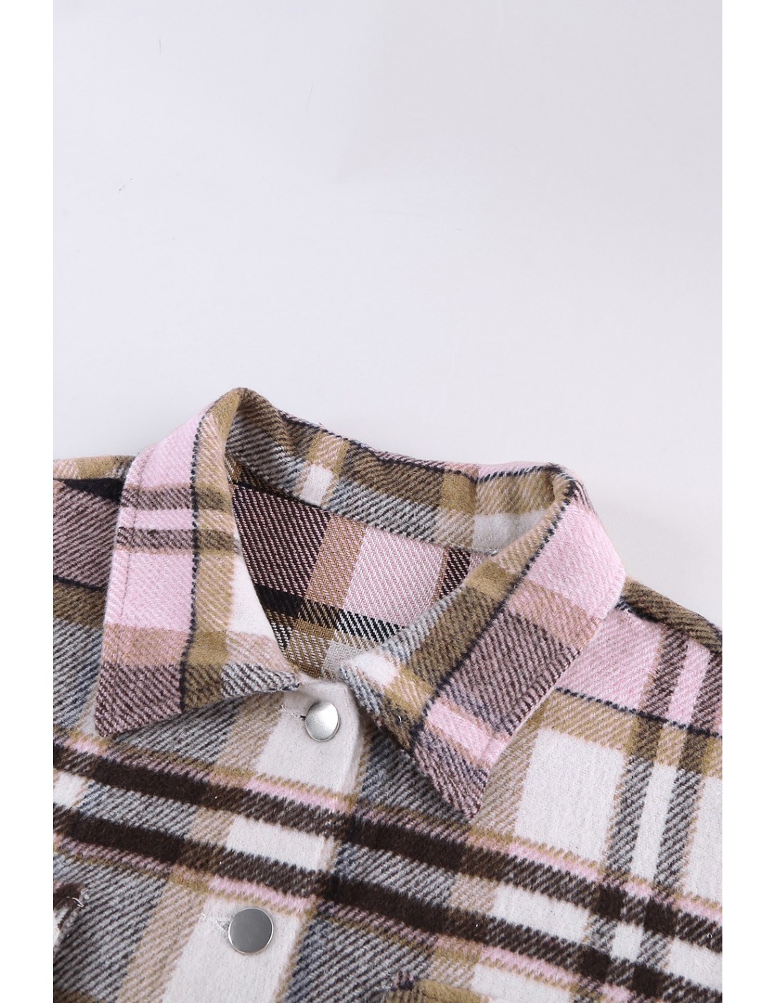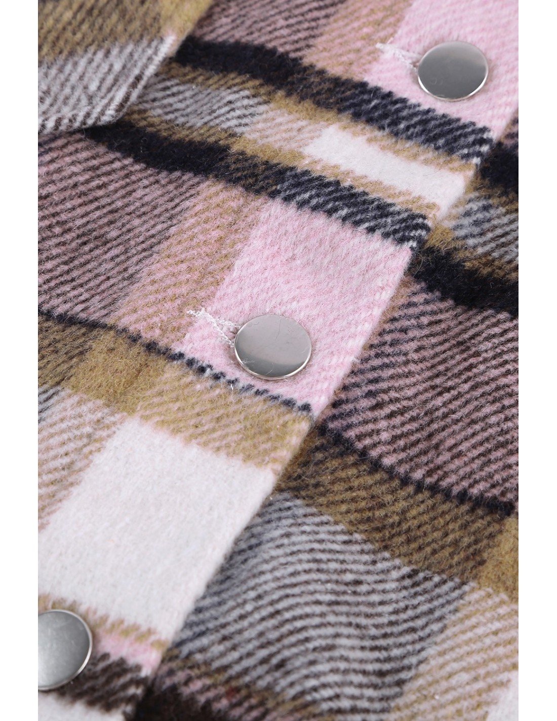 Damenhemd mit Karomuster im Tartan-Stil in rosa Farben. Dieses langärmlige Hemd mit lockerer, entspannter Passform ist mit Metallknöpfen und zwei Vordertaschen am Oberkörper verziert. Die Taschen sind nutzbar. Der Stoff ist sehr weich, das Polyestermaterial erinnert an gemütliche Überwürfe. Das Shirt hält warm.