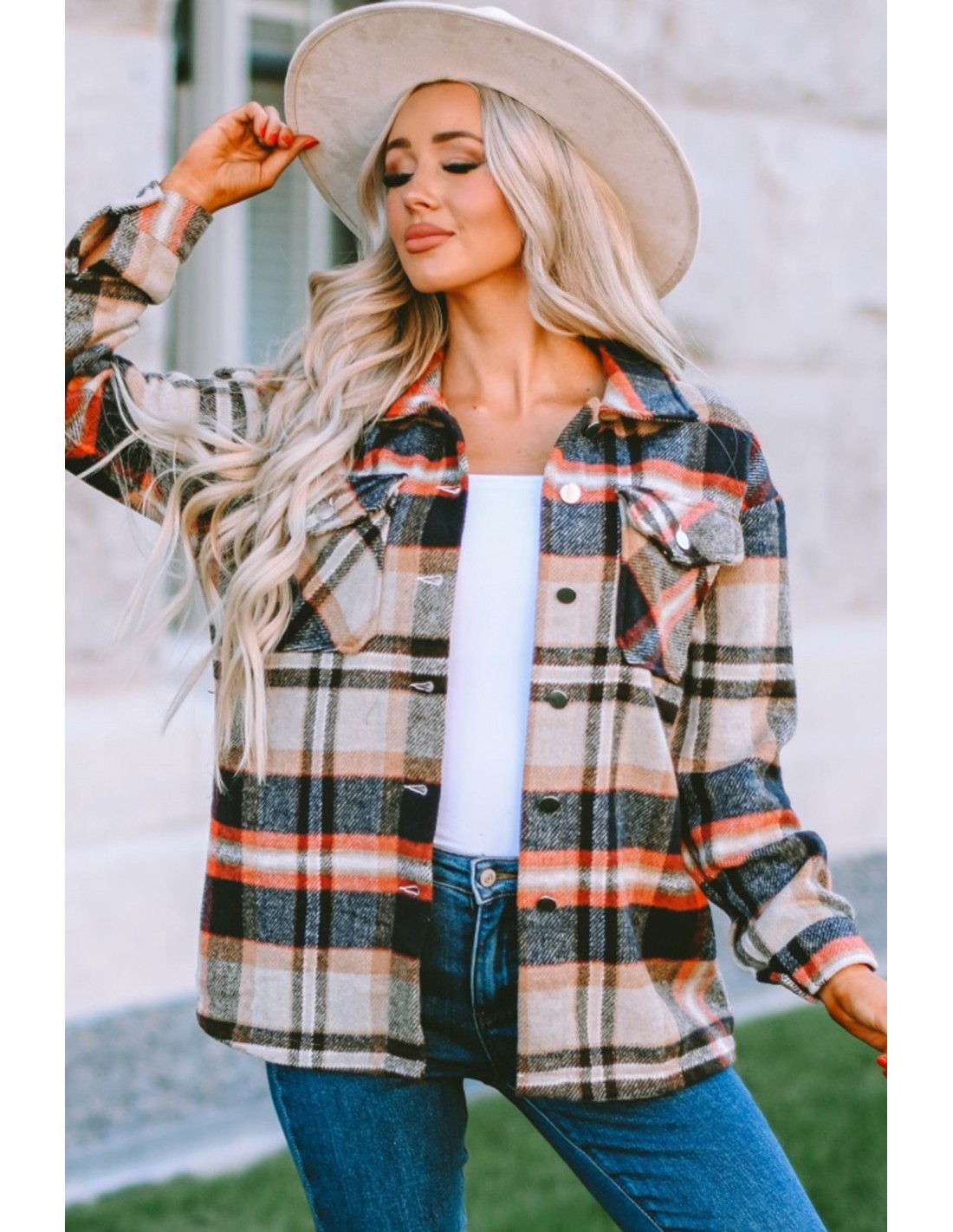 Damenhemd mit Karomuster im Tartan-Stil in den Farben Beige, Orange und Rot. Dieses langärmlige Hemd mit lockerer, entspannter Passform ist mit Metallknöpfen und zwei Vordertaschen am Oberkörper verziert. Die Taschen sind nutzbar. Der Stoff ist sehr weich, das Polyestermaterial erinnert an gemütliche Überwürfe. Das Shirt hält warm.