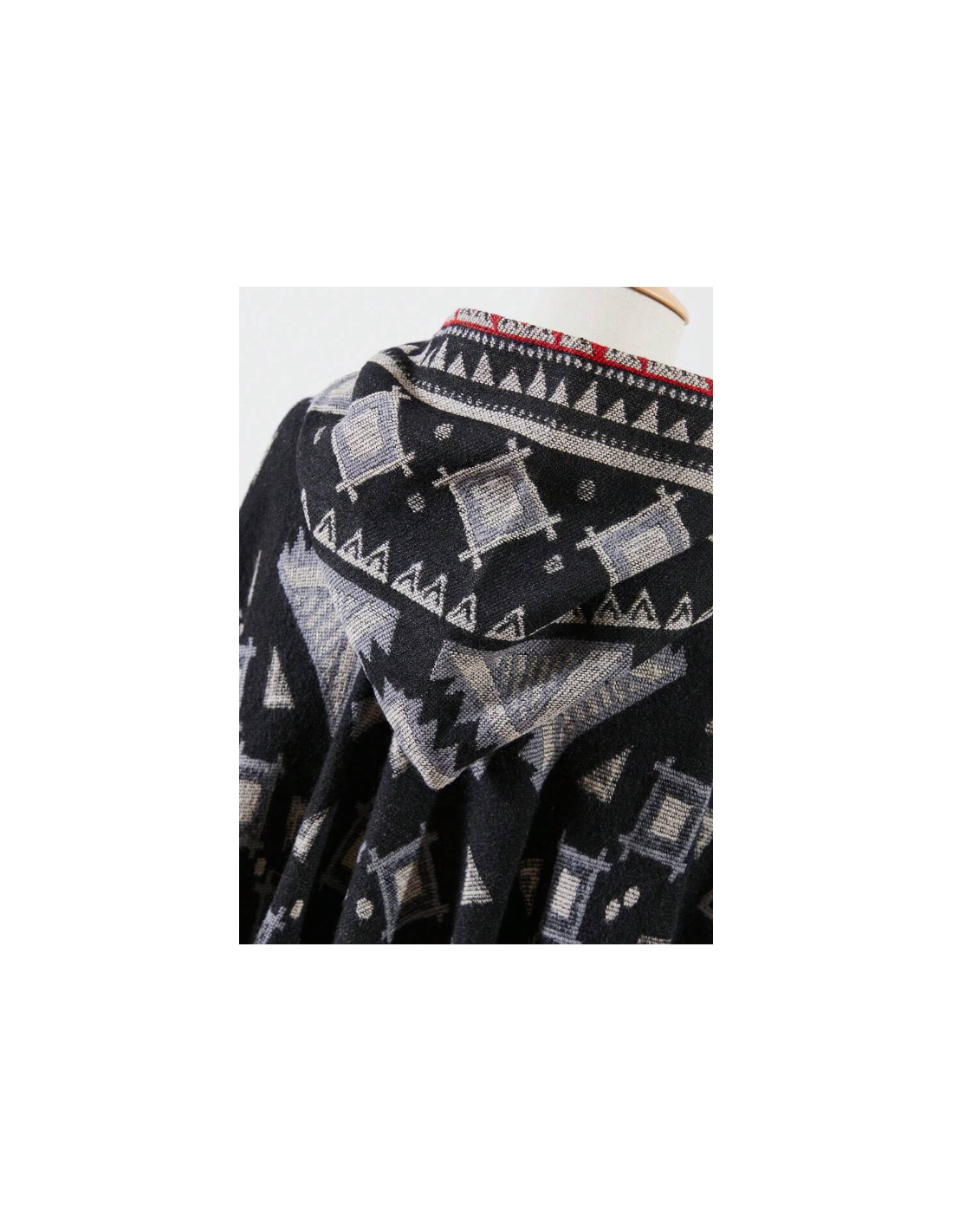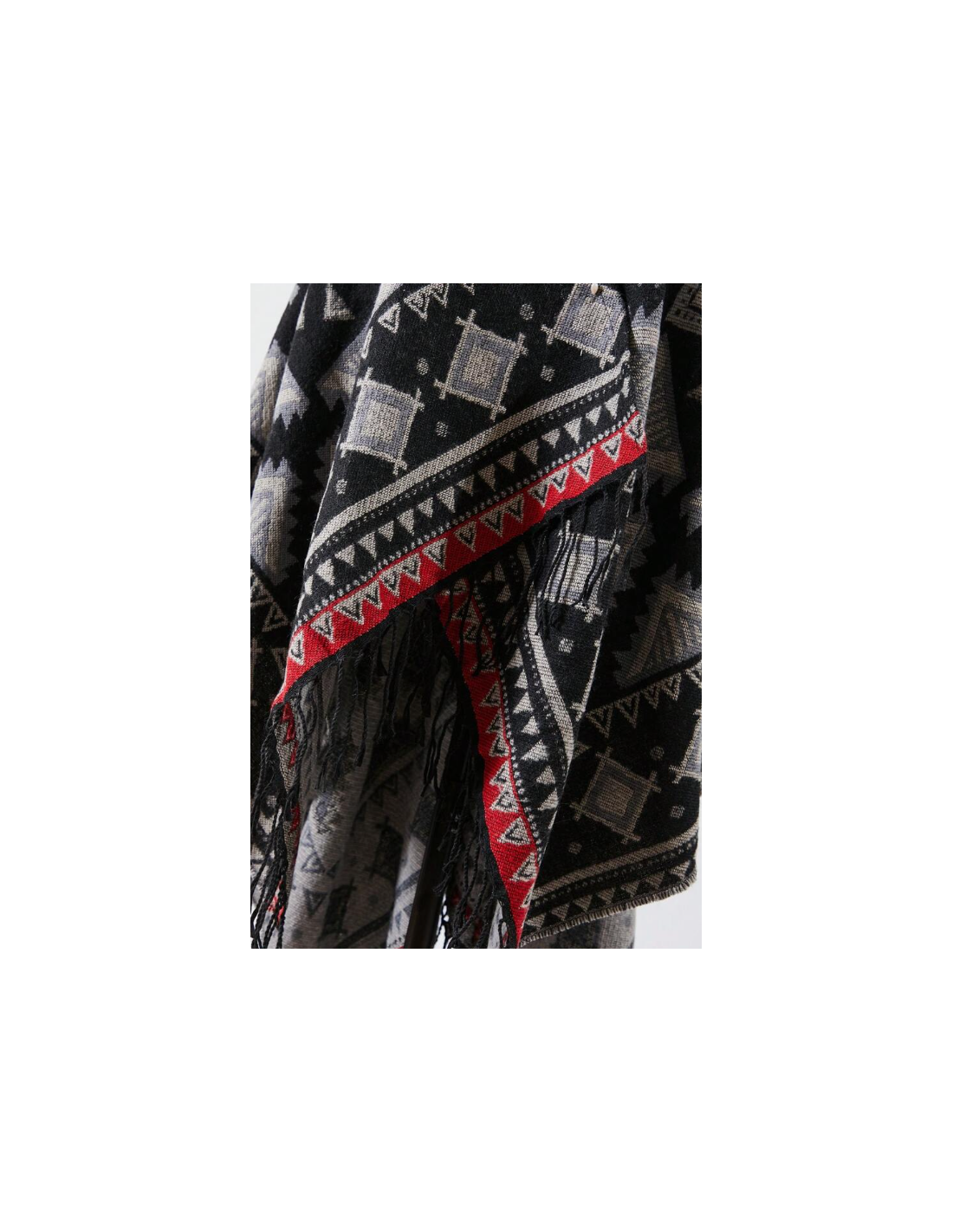 Entdecken Sie unseren Boho-Poncho für Damen, ein wahres Symbol der Bohème-Ästhetik. Präsentieren Sie stolz seine geometrischen Muster in Rot, Weiß und Grau auf schwarzem Hintergrund und schaffen Sie so einen optisch faszinierenden Kontrast. Dieser aus Polyester gefertigte Kapuzenponcho ist ebenso bequem wie trendig. Seine Einheitsgröße passt perfekt zu den Größen 38 bis 52 und bietet eine spürbare Vielseitigkeit. Dieser Poncho eignet sich perfekt für ein lässiges Outfit mit künstlerischem Touch und ist ein Muss für alle, die Originalität und Komfort suchen.