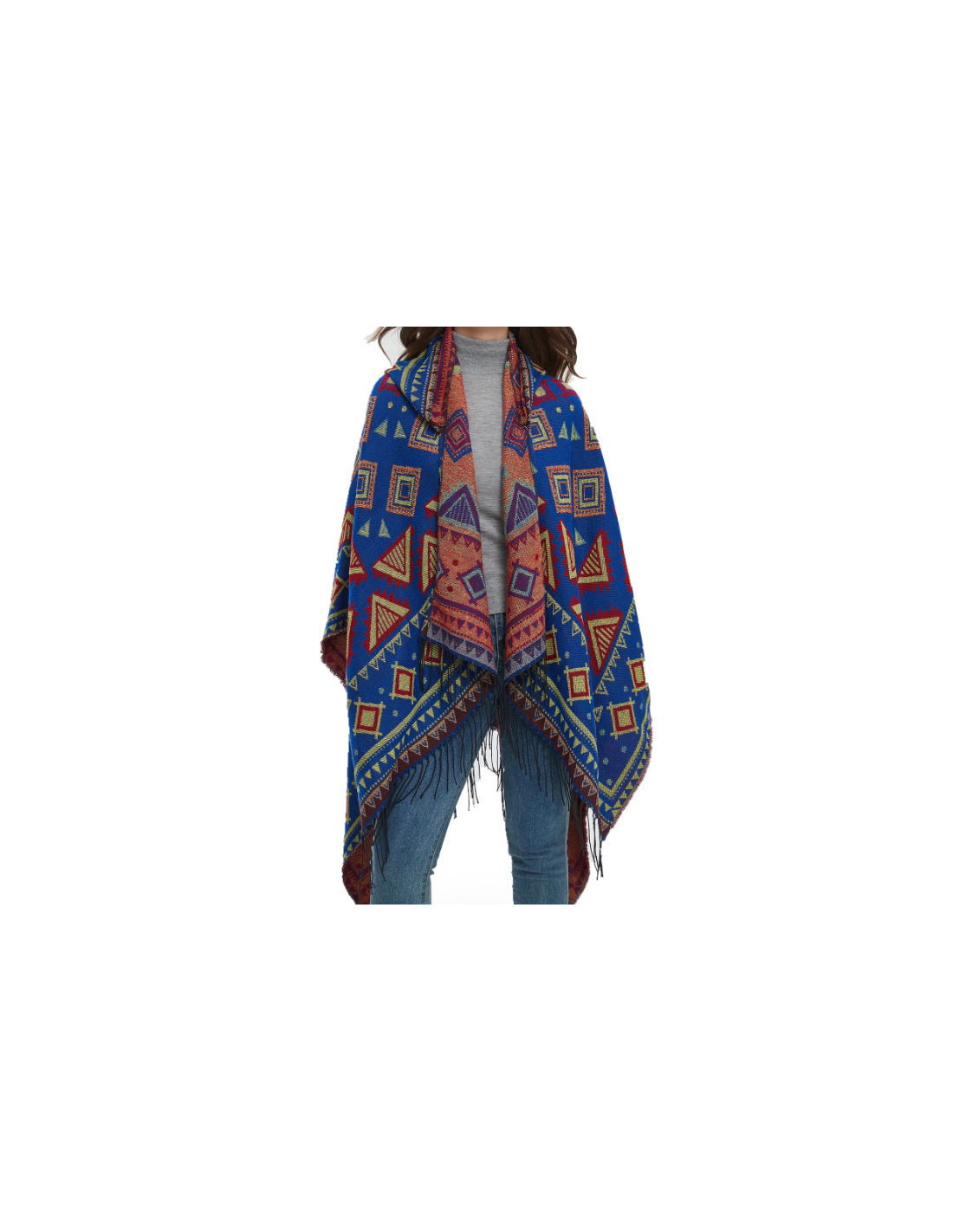 Entdecken Sie unseren Boho-Poncho für Damen, ein wahres Symbol der Bohème-Ästhetik. Präsentieren Sie stolz seine geometrischen Muster in Rot, Orange und Gelb auf einem königsblauen Hintergrund und schaffen Sie so einen optisch faszinierenden Kontrast. Dieser aus Polyester gefertigte Kapuzenponcho ist ebenso bequem wie trendig. Seine Einheitsgröße passt perfekt zu den Größen 38 bis 52 und bietet eine spürbare Vielseitigkeit. Dieser Poncho eignet sich perfekt für ein lässiges Outfit mit künstlerischem Touch und ist ein Muss für alle, die Originalität und Komfort suchen.