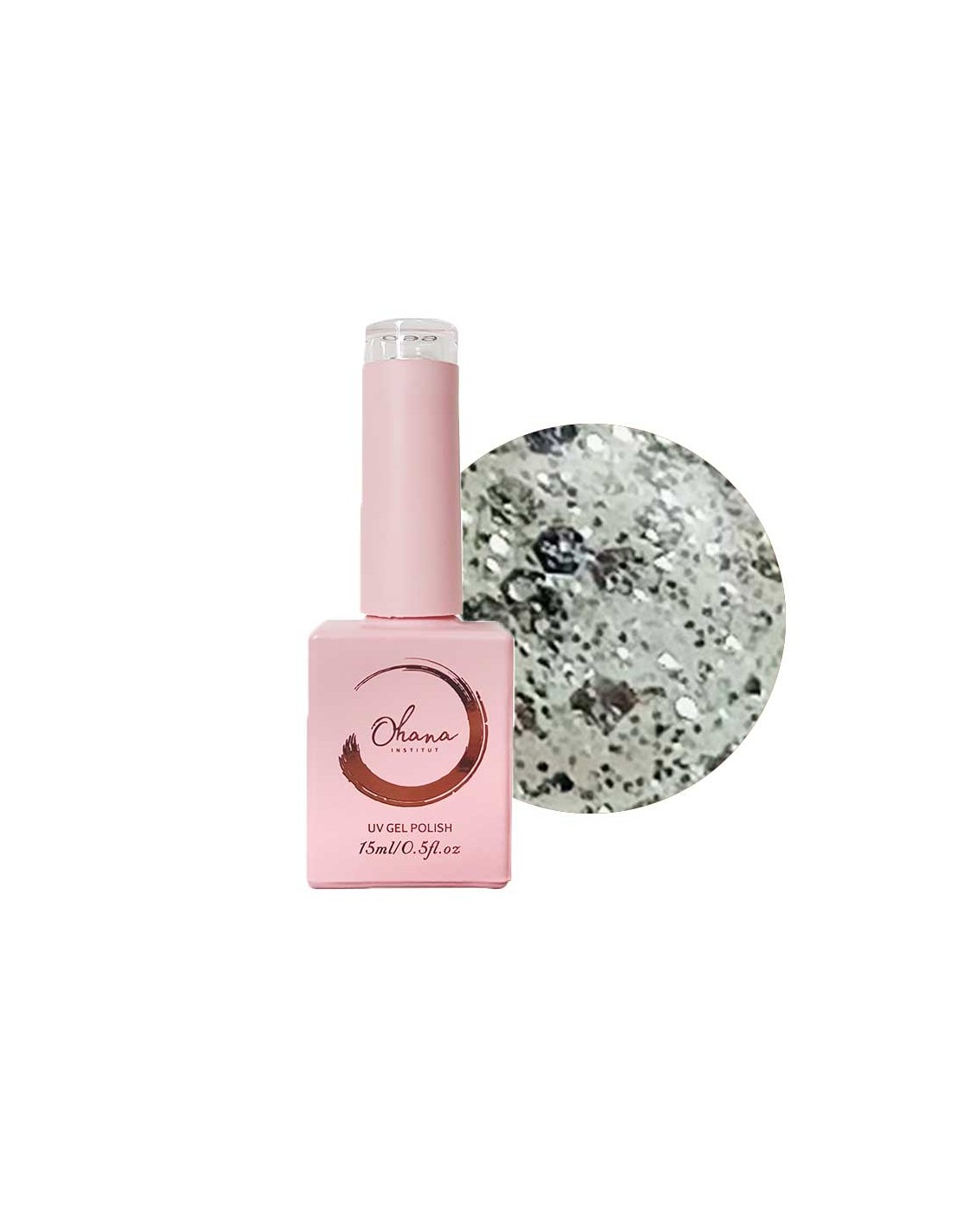 Dieser semi-permanente silberne Glitzer-UV-Gel-Nagellack aus dem Ohana-Institut ist ein brillanter und lang anhaltender Farbton.