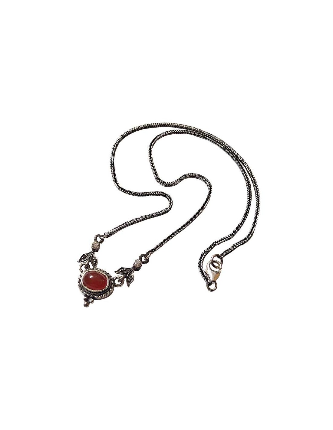 Diese Halskette mit engen und halbstarren, ausgefallenen Gliedern hat einen Vintage-Stil. Der Anhänger ist mit Pflanzenmotiven mit zwei weißen Kristallen und in der Mitte mit einem Bernsteinstein von wunderschöner rot-oranger Farbe verziert.