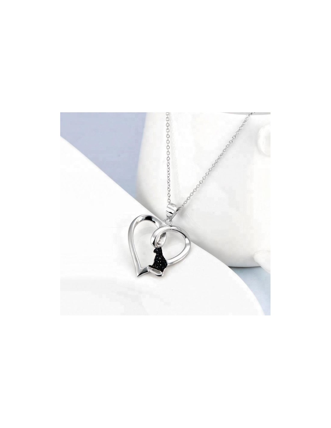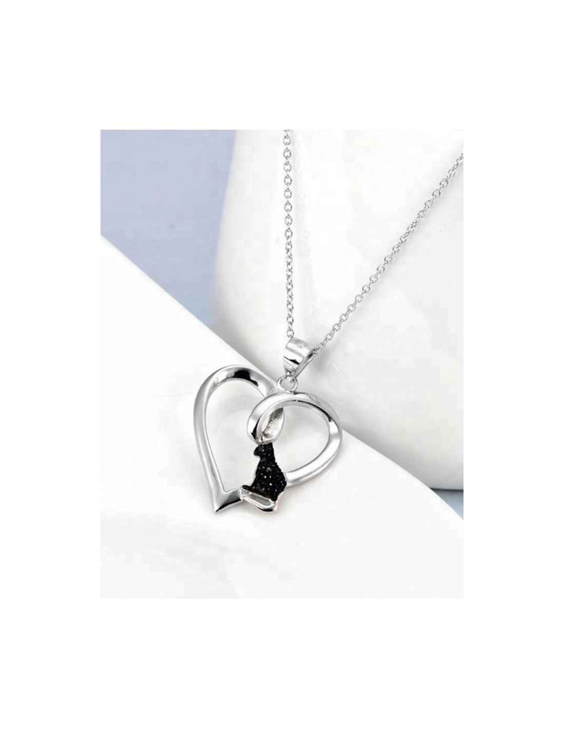 Halskette und Anhänger aus 925 Silber. Die Kette ist mit klassischen runden Gliedern, in Silber. Der Anhänger ist herzförmig mit einer schwarzen Katze im Inneren, letztere ist mit Zirkonen verkrustet.