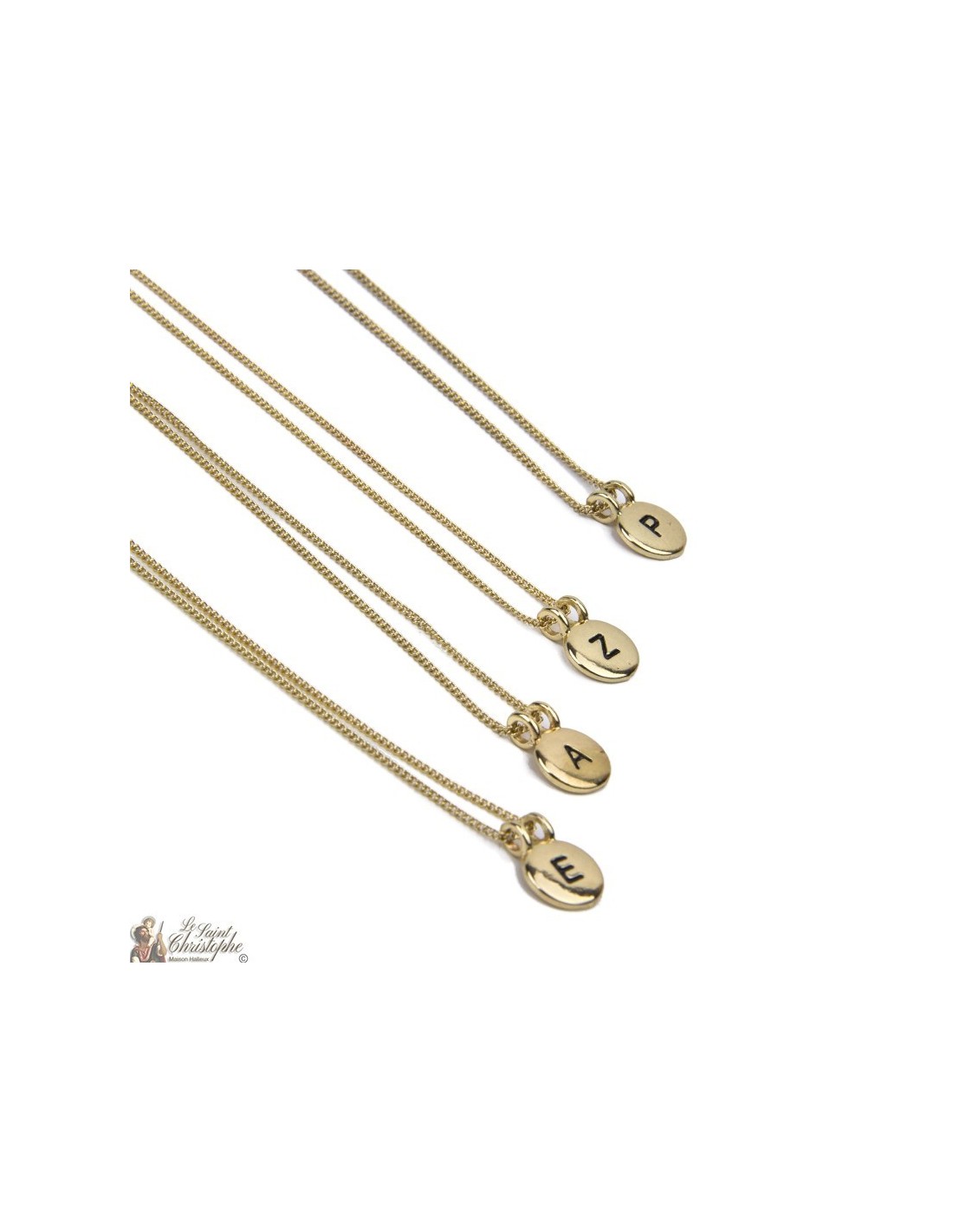 Halskette von 45 bis 50 cm Länge mit rundem Anhänger. Das Ganze ist vergoldet. Die Medaille ist mit dem Buchstaben Q geprägt.