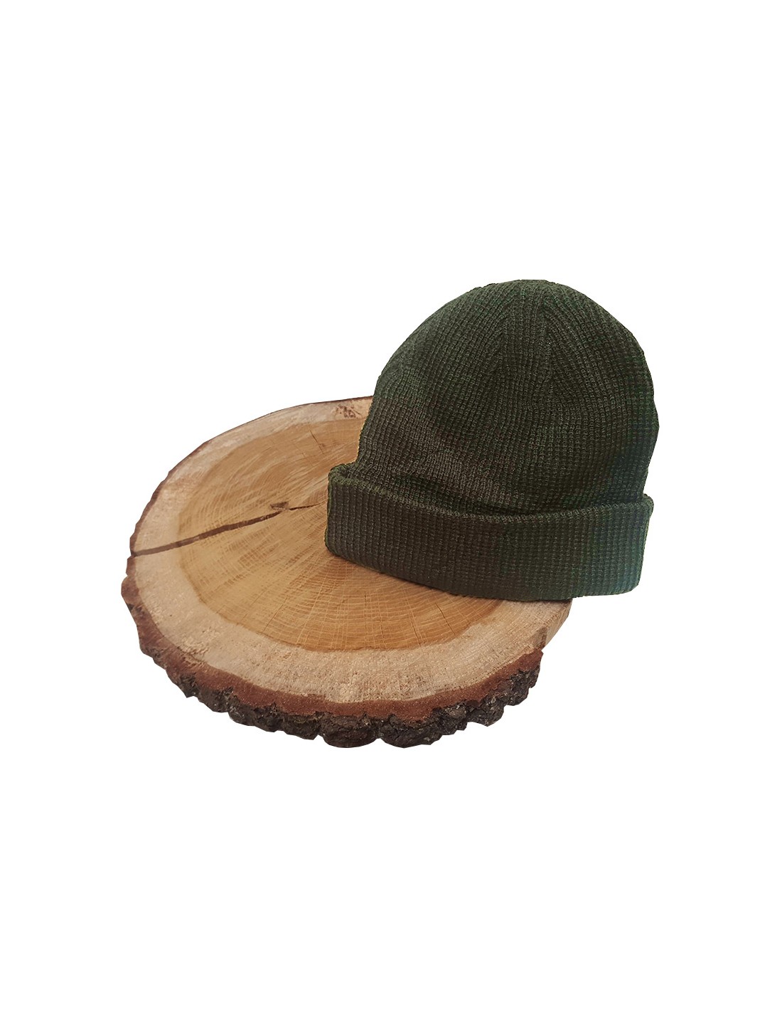 Gestrickte Mütze aus dunkelgrüner Wolle. Die Wollmütze ist ein praktisches und modisches Accessoire, das man nicht missen möchte.
