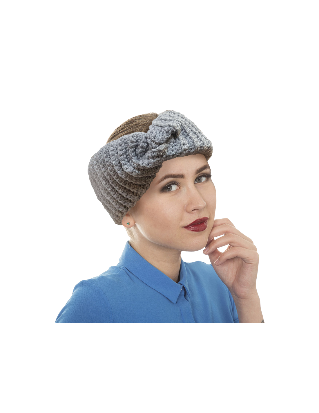 Gedrehtes Headband aus Wolle, handgehäkelt, hellgraue Farbe. Dieses Accessoire hält im Winter warm und ist gleichzeitig trendy - egal, welche Frisur Sie tragen!