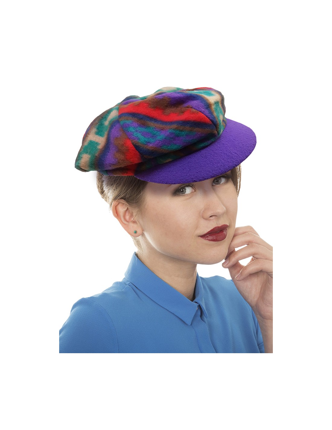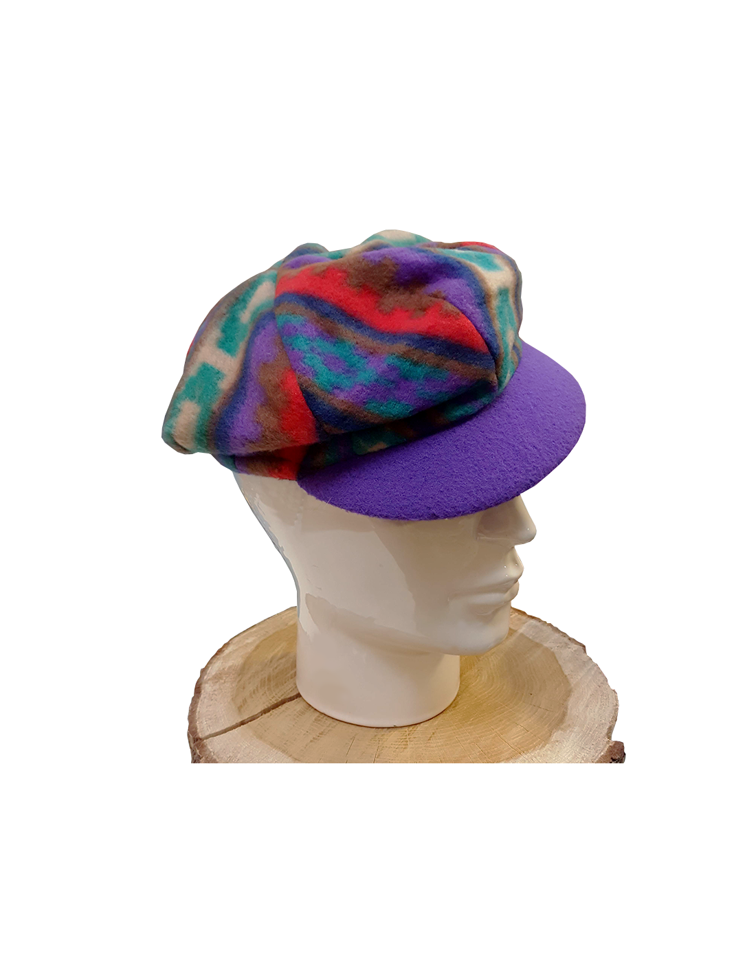 Lila Gavroche-Mütze für Damen aus Polyester mit mehrfarbigem, geometrischem Muster. Diese Kopfbedeckung in leuchtenden Farben ist perfekt, um an grauen oder kalten Tagen ein wenig Lebendigkeit zu verleihen.