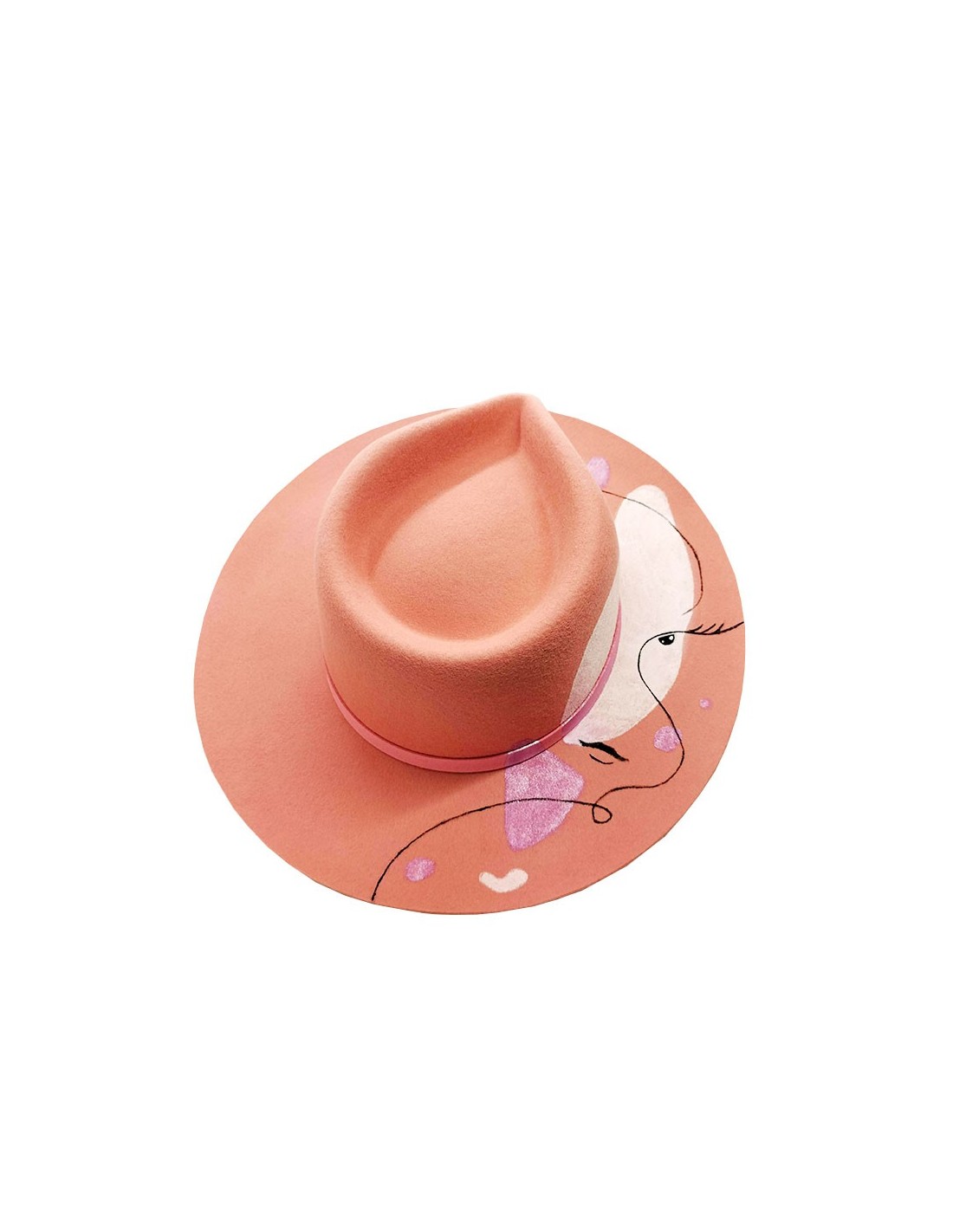 Handgefertigter Fedora-Hut aus Frühlingsfilz mit breiter, bonbonrosafarbener Krempe, der mit mehreren rosa-metallicfarbenen und weißen Vollflächen, eleganten schwarzen Kurven und Strichen bemalt ist, die ein weibliches Gesicht andeuten. Er ist mit einer rosafarbenen Wildlederlasche mit drei grauen Quadraten verziert.