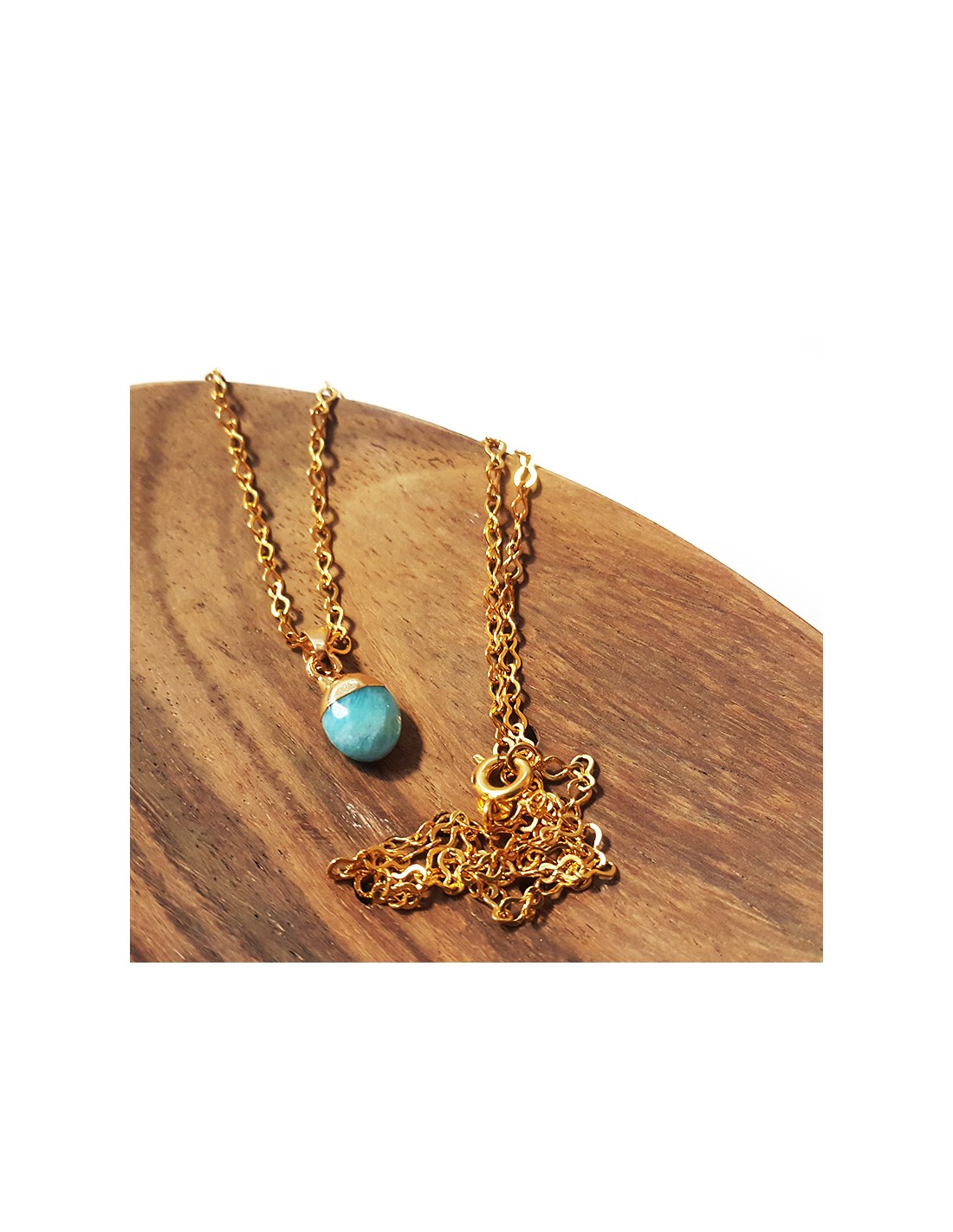Dieser Anhänger aus blauem Jaspis ist dezent und charmant. An der Oberseite vergoldet, ist der Stein sanft in Tropfenform geschliffen und facettiert. Die vergoldete Kette wird mitgeliefert.