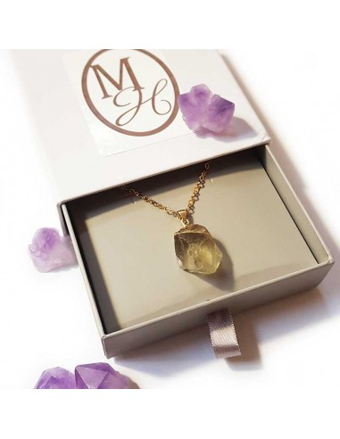 Halskette mit Anhänger aus rauem Zitronenquarzstein. Die mit dem Anhänger gelieferte Kette ist in verschiedenen Designs erhältlich.