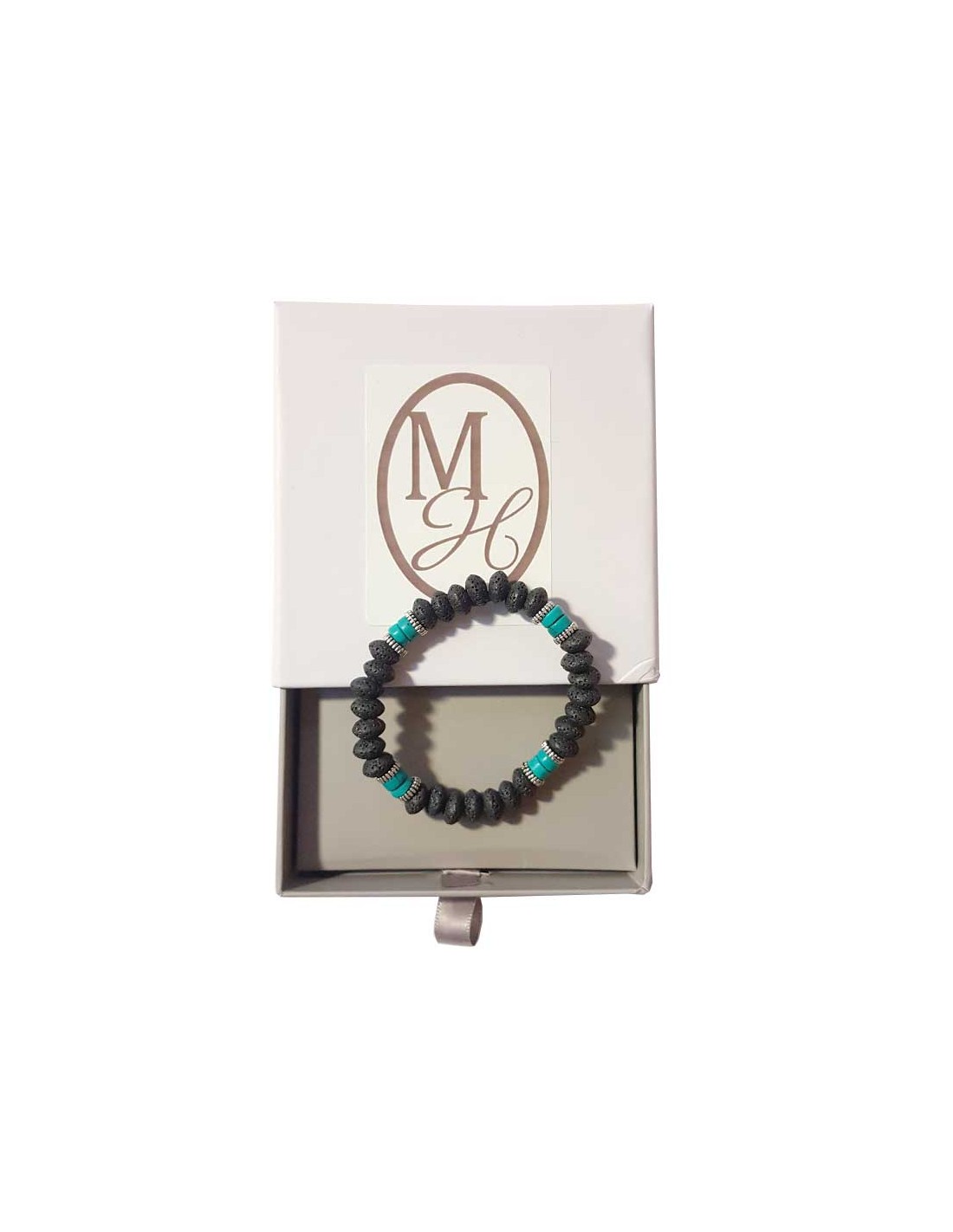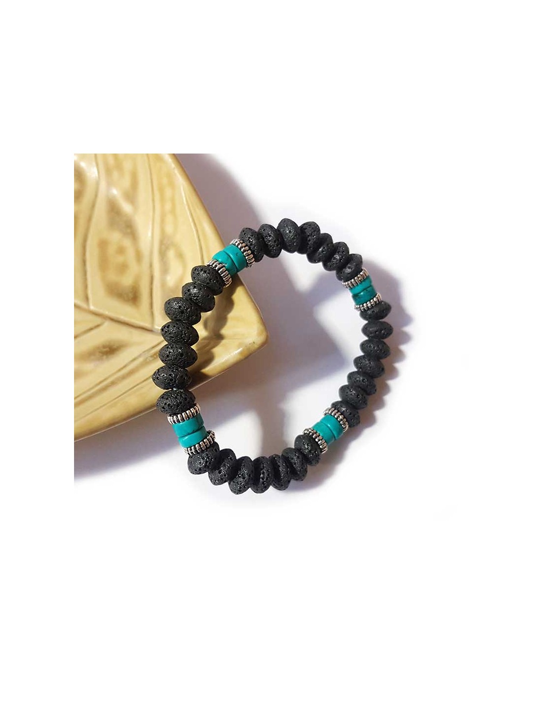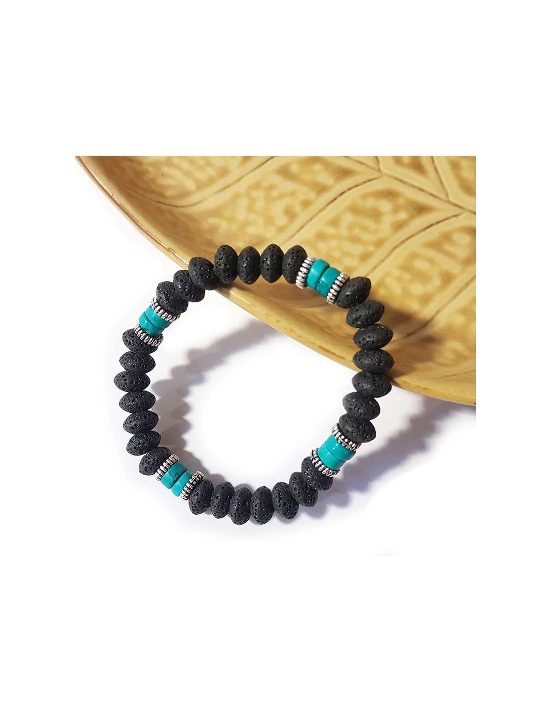 Armband aus Perlen aus Lavastein und Türkis. Lavastein ist saugfähig und man kann ein paar Tropfen Parfüm oder ätherisches Öl darauf geben, um den Tag zu versüßen! Der Türkis ist ein regenerierender und kommunikativer Stein.