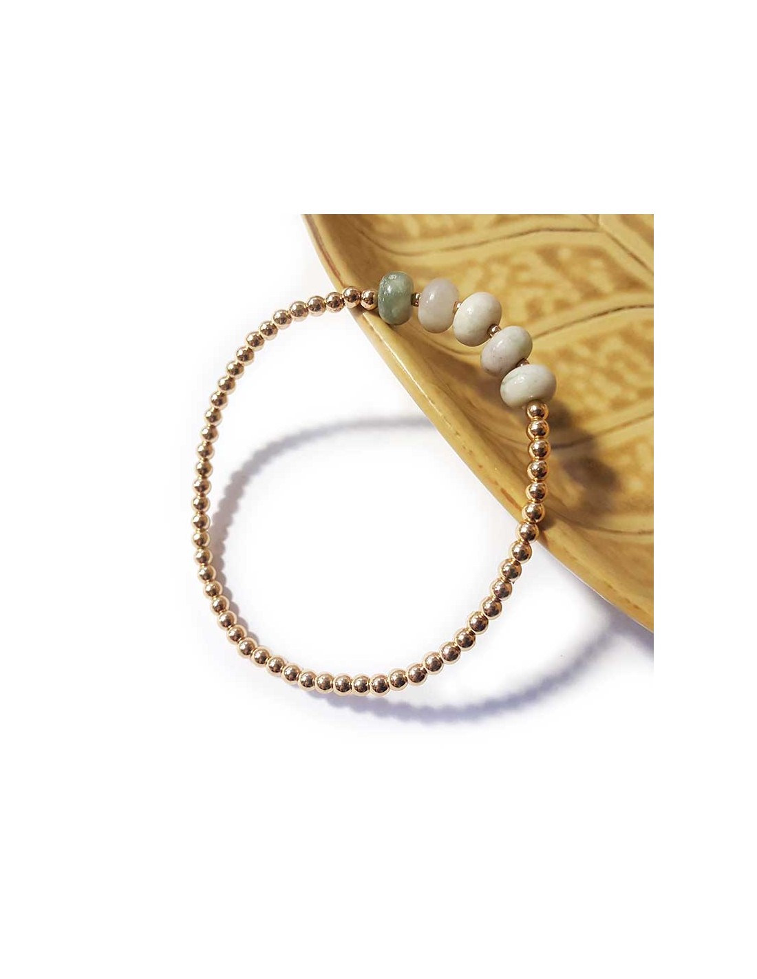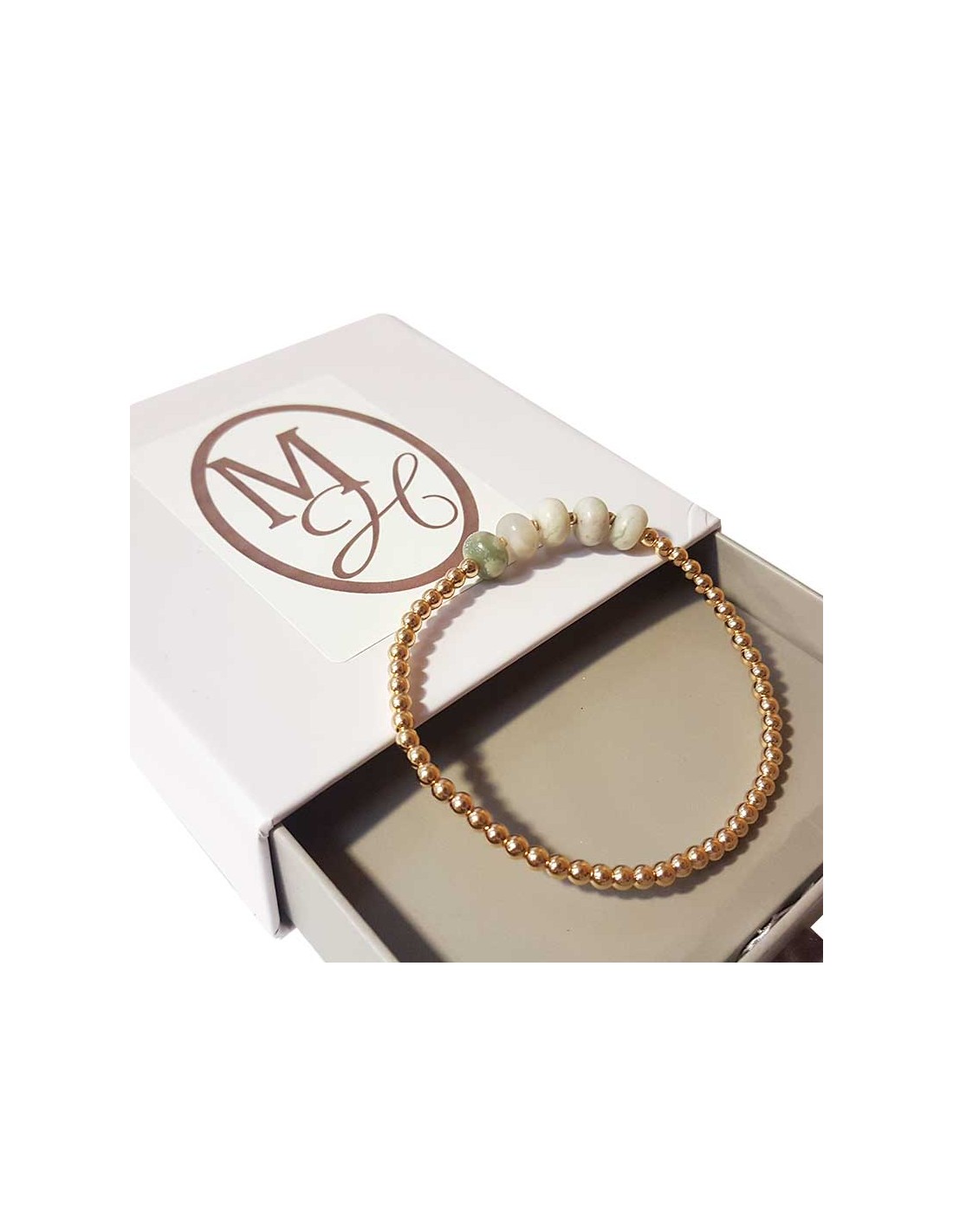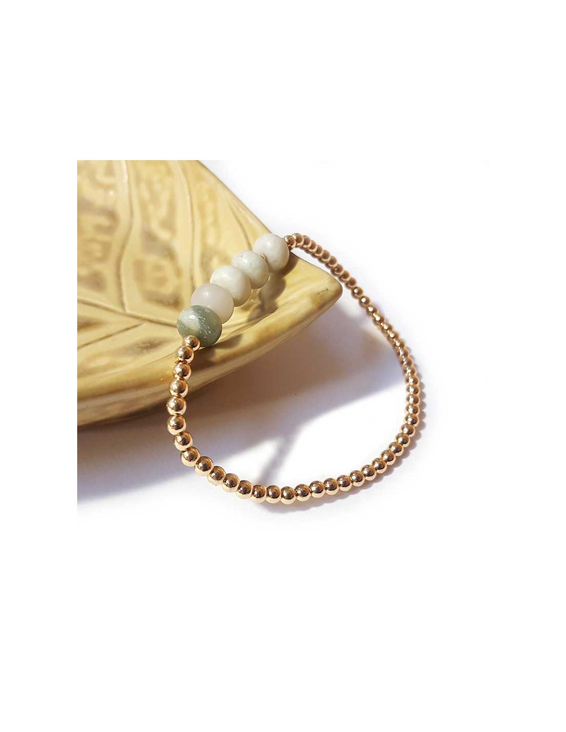 Armband mit goldenen Perlen und fünf runden weißen Jaspisperlen. Trendig und dezent, ein leuchtendes Schmuckstück, das einen Hauch von Natürlichkeit verleiht.