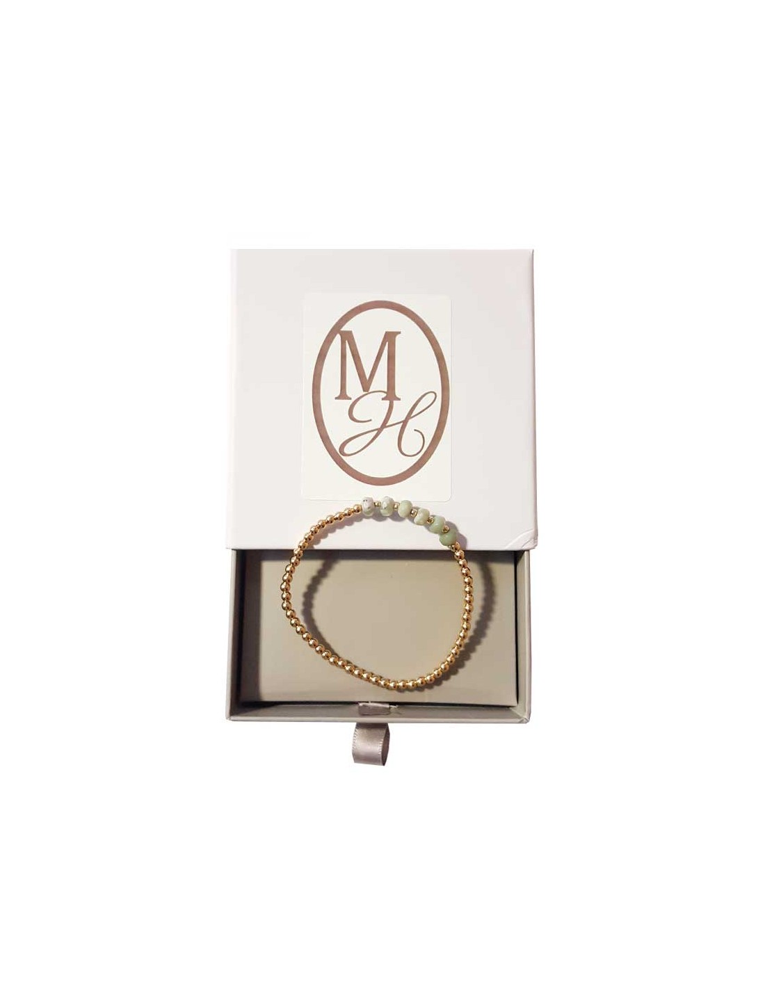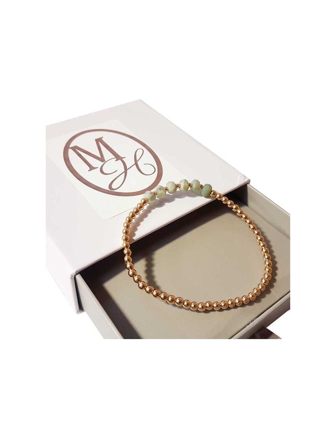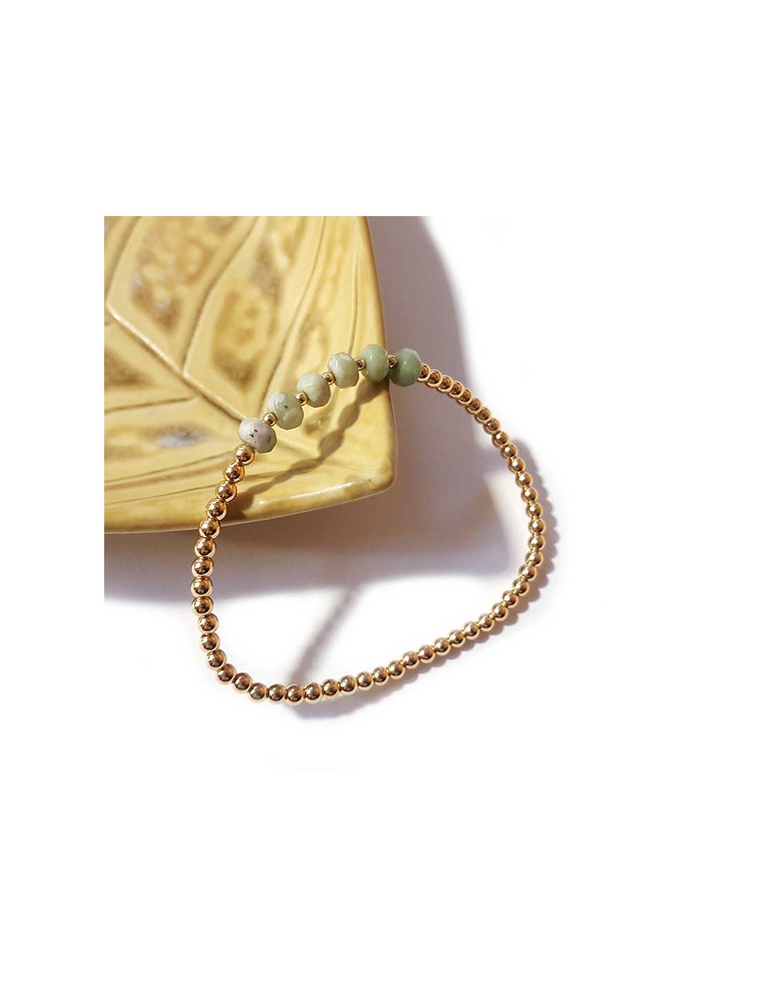 Armband mit kleinen goldenen Perlen und fünf facettierten Perlen aus weißem Jaspis. Trendig und dezent, ein leuchtendes Schmuckstück, das einen Hauch von Natürlichkeit verleiht.