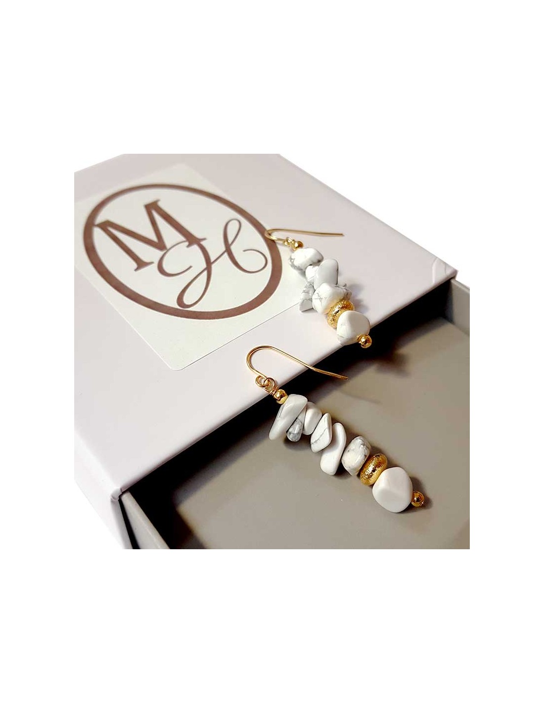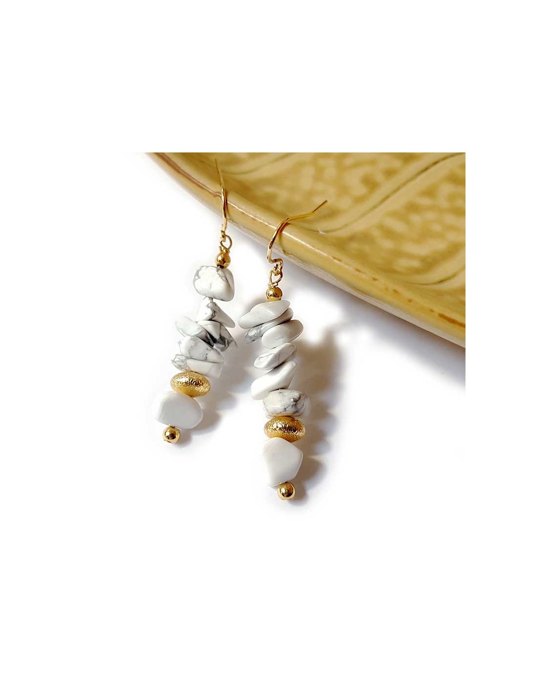 Vergoldete Hängeohrringe mit kleinen Stücken aus Howlith-Rocailles, die aufgereiht und mit einer goldenen Perle verziert sind.