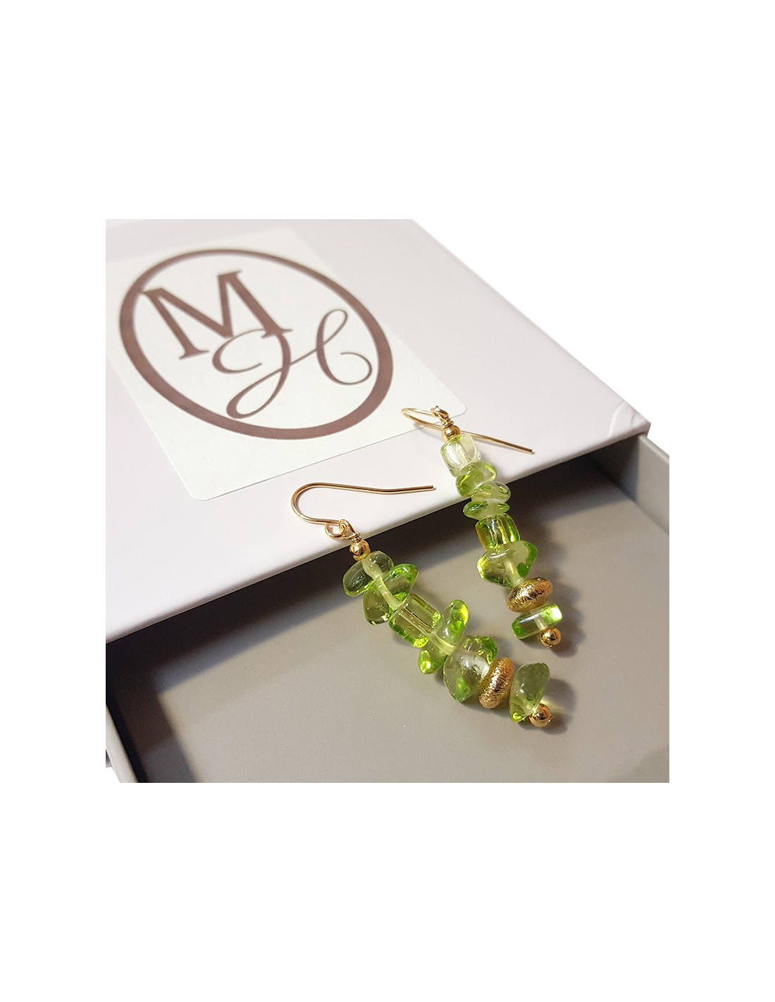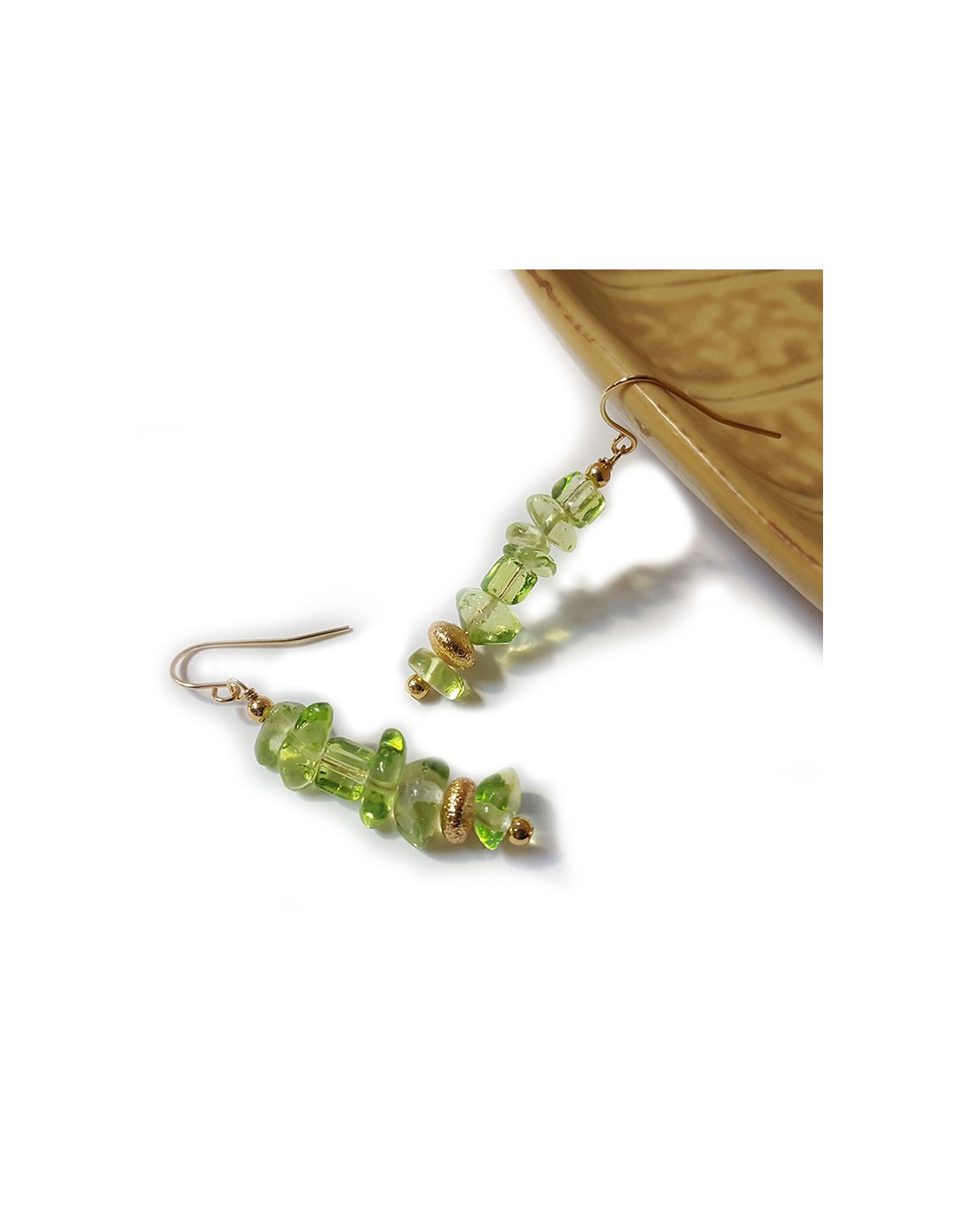 Diese schicken Ohrringe sind typisch für den Bohème-Stil! Natürlich, glänzend und ein wenig schräg, verleihen sie einen dezenten und trendigen Farbtupfer. Der durchscheinende, apfelgrüne Kristall verleiht dem Schmuckstück eine prickelnde und energiegeladene Note.