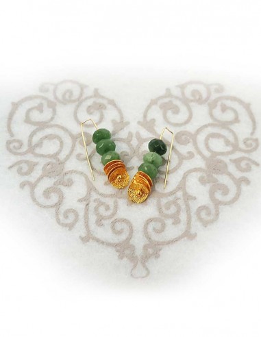 Diese Hängeohrringe sind schlank und elegant und verleihen gleichzeitig einen natürlichen und exotischen Touch. Sie sind mit drei facettierten Perlen aus grüner Jade und goldenen Chips verziert und passen zu allem.