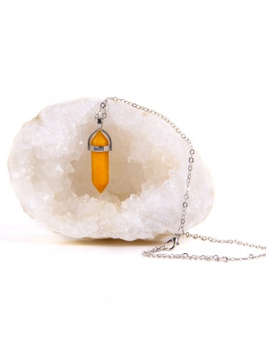 Versilberte Halskette mit gelbem Achatstein-Anhänger. Der gelbe Achat hat eine orange bis goldgelbe Farbe und symbolisiert Wohlstand und Freude. In der Energetik ist es als wirksam bei der Verbesserung der geistigen Fähigkeiten, der Überwindung negativer Energien und vielen anderen Tugenden anerkannt.
