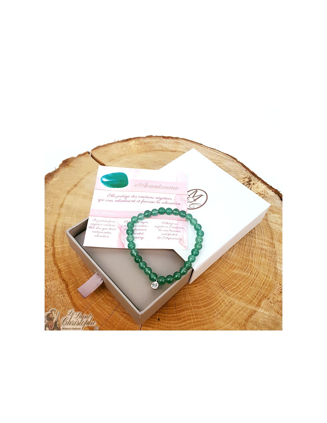 Mit seinen zarten Grüntönen ist der Aventurin ein Stein, der mit dem Herzchakra verbunden ist, das die Emotionen beruhigt und ausgleicht, indem es negative Emotionen, die uns bremsen, abwehrt. So beruhigt es den Geist und fördert Entspannung, Loslassen und bedingungslose Liebe. Er schützt den Träger auch vor negativen Energien oder Menschen, die dazu neigen, unsere Moral und Energie zu verringern. Mit einem klareren Verstand ermöglicht der Aventurin eine bessere Selbsterkenntnis, trägt zu einer besseren Autonomie und einer größeren Kreativität bei, indem er unseren Horizont erhellt. Nach den Grundsätzen der Lithotherapie ist der Aventurin auf körperlicher Ebene nützlich für die Muskeln bei Schmerzen und zur Stärkung von Herz und Lunge.