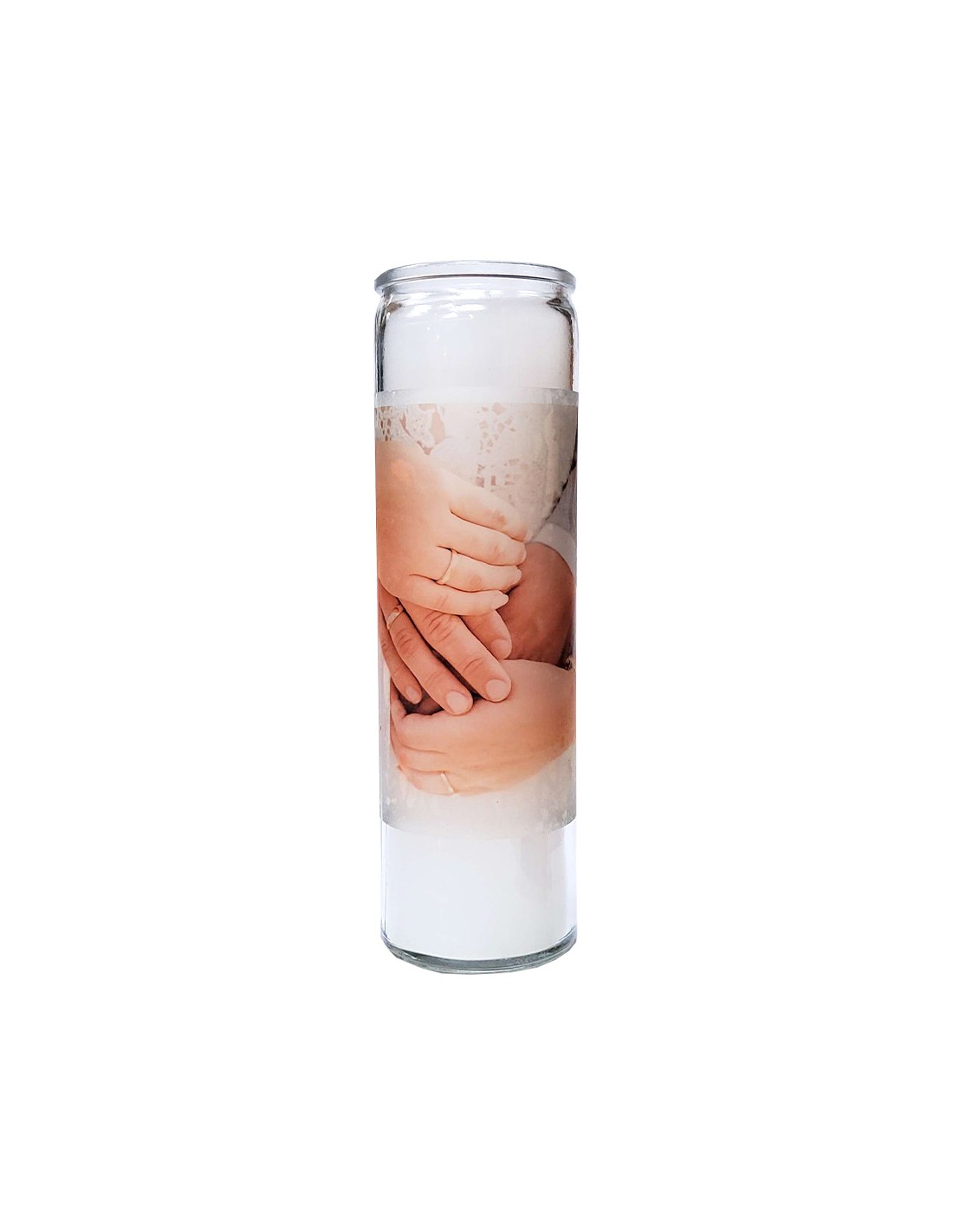 Mit dem Bild der Hände eines Paares und einem romantischen Zitat ist diese Kerze perfekt, um für eine originelle Stimmung zu sorgen!