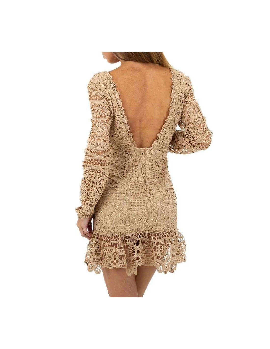 Kurzes beiges Kleid mit langen Ärmeln und Spitzenmuster auf dem ganzen Stoff. Die Ärmel sind durchbrochen und der Boden ist mit einem schönen Volant verziert.