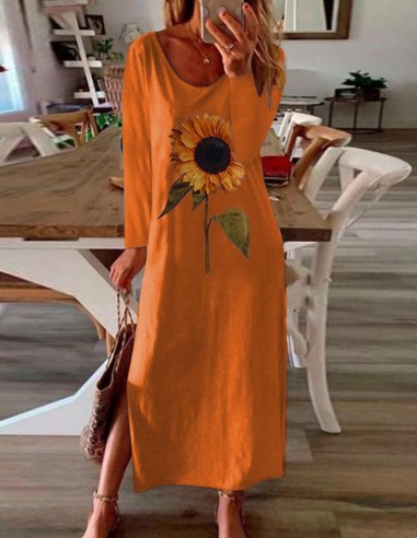 Langes orangefarbenes Kleid aus Polyester, mit einer großen Sonnenblume auf der Vorderseite bedruckt. Ein typisches Kleid der Bohème.