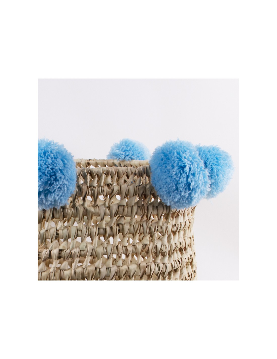 Set aus drei runden geflochtenen Körben mit Quasten. Die Körbe sind durch ihre unterschiedlichen Größen nestbar. Sie sind komplett handgefertigt und werden aus getrockneten Palmblättern geflochten, einem leichteren und flexibleren Material als Weide. Die sechs Wollbommel an jedem Korb sind in einem schönen Hellblau gehalten.