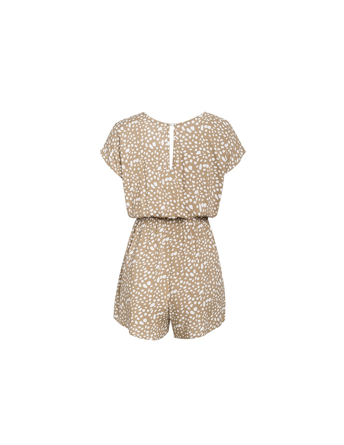 Kurze und leichte Latzhose aus Polyester und Baumwolle. Mit einem beigen Hintergrund und weißen Punkten ist es ein perfektes Boho-Kleidungsstück!