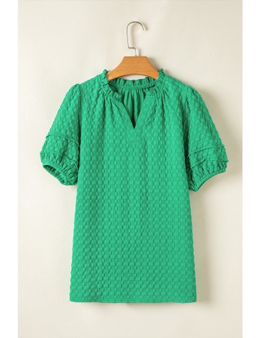 Dieses modische Damen-Top besteht aus einzigartigem strukturiertem Stoff. Es hat einen fransigen Kragen und puffige Kurzärmel für einen zusätzlichen Charme. Der V-Ausschnitt verleiht ihm eine feminine und elegante Note. Dieses einfarbige Top lässt sich perfekt mit jeder Hose kombinieren und ist vielseitig einsetzbar.