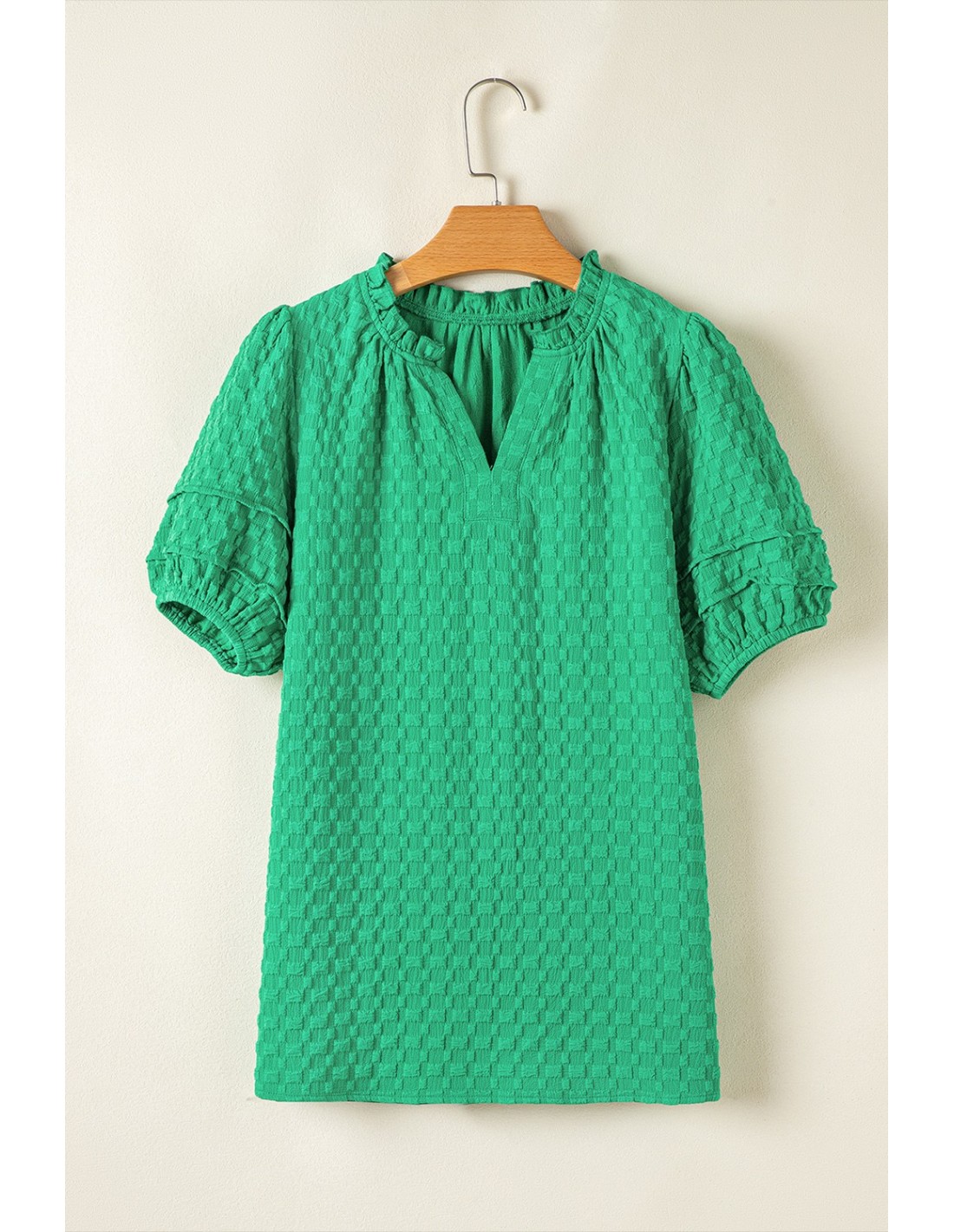 Grünes Texturiertes Puff-Kurzarmshirt mit Ausschnitt im V-Stil