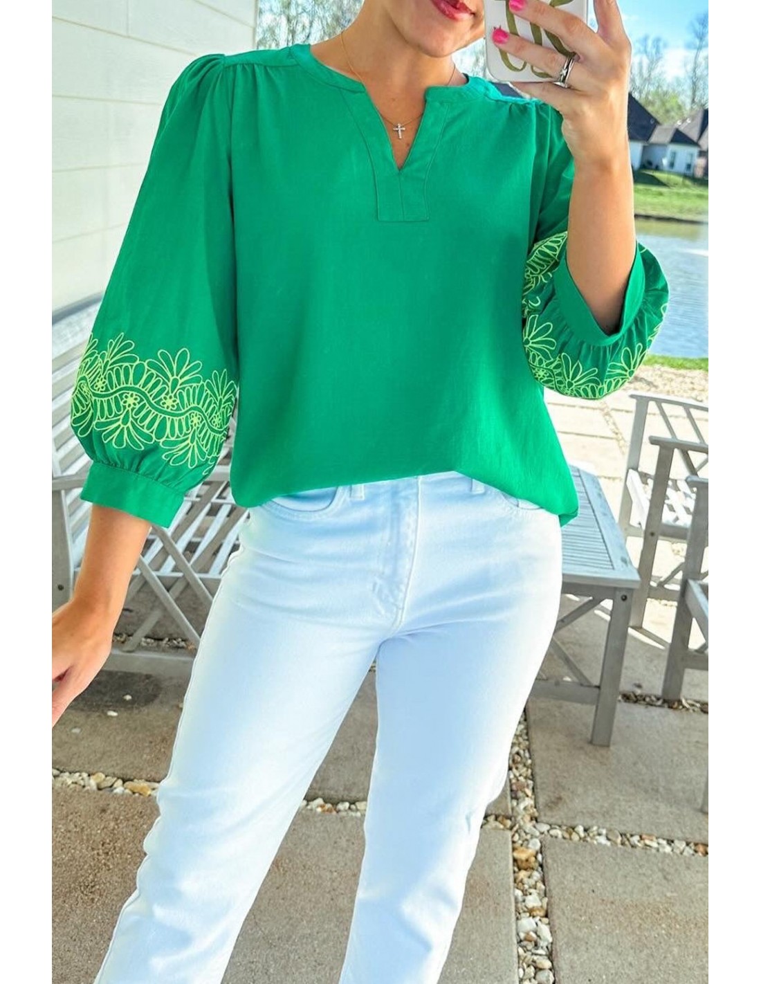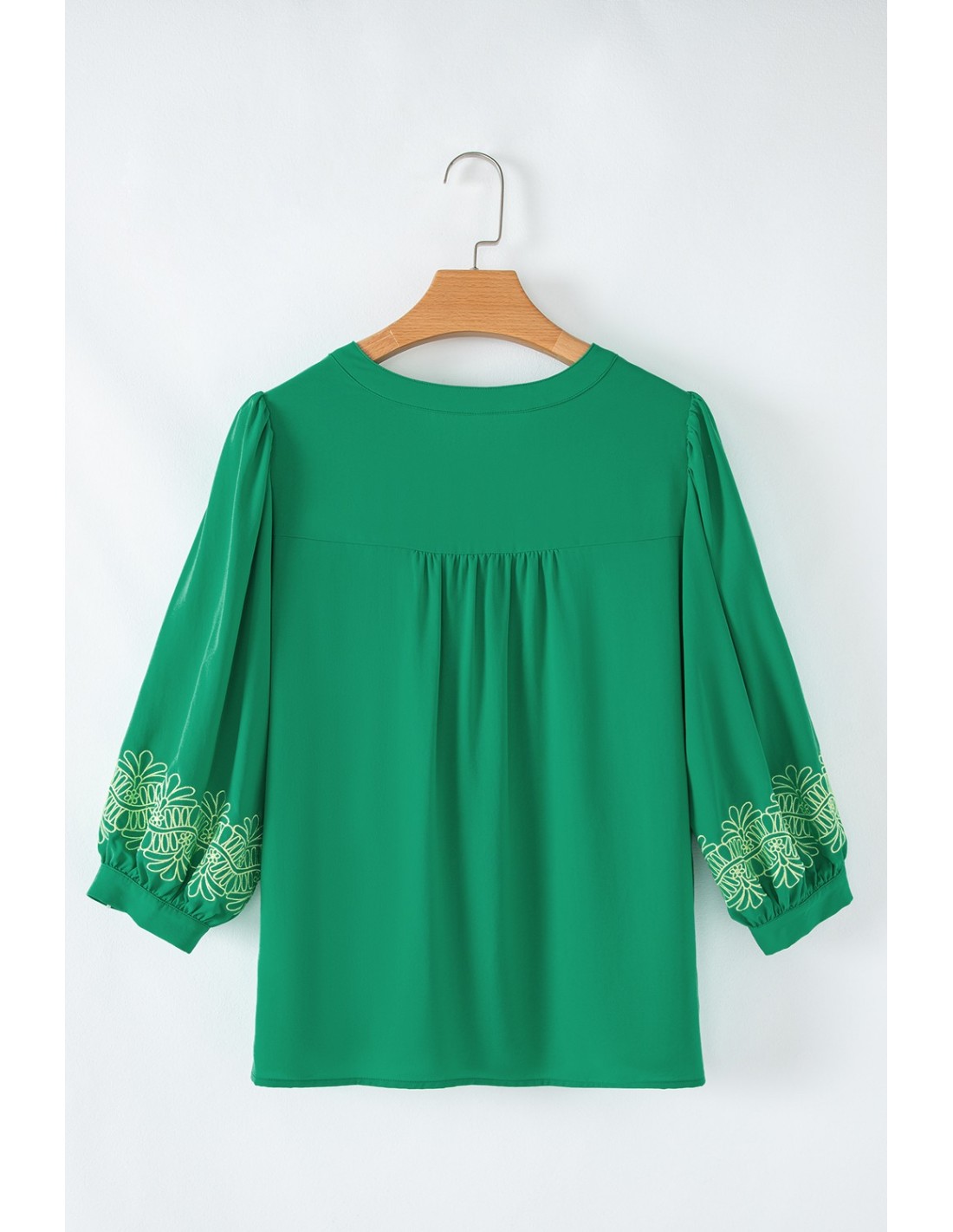 Elegante Grüne Bluse mit Floralstickerei und 3/4-Ärmeln und Ausschnitt im V