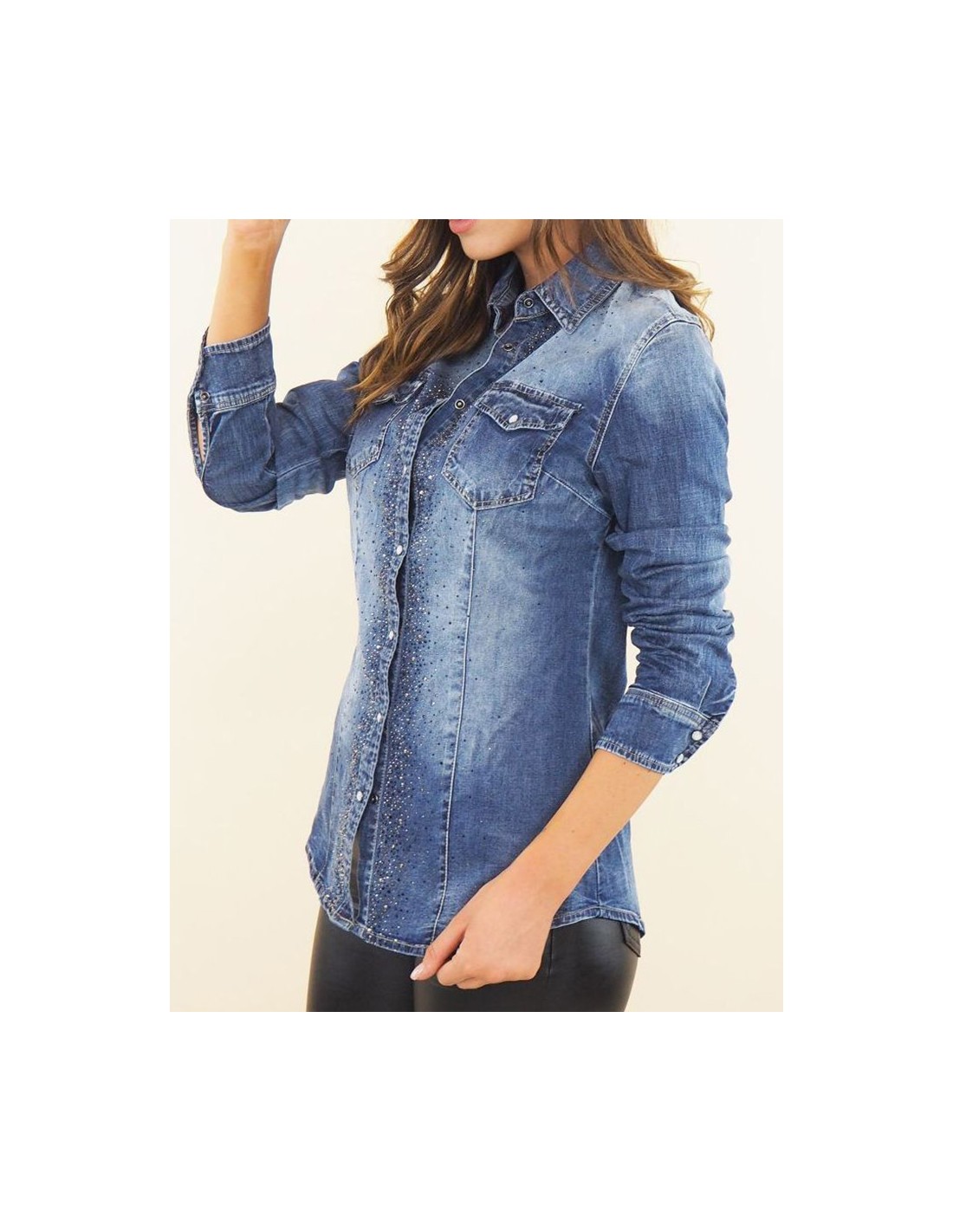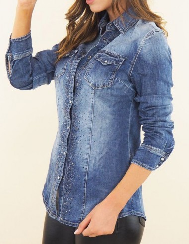 Blaues Jeanshemd mit hellblauem Wascheffekt an den Schultern und der Brust, zwei Pattentaschen vorne am Herzen und Strasssteinen entlang der Knopflöcher. Mit seinem klassischen Schnitt und den Pailletten bietet es viel Platz zum Blenden.