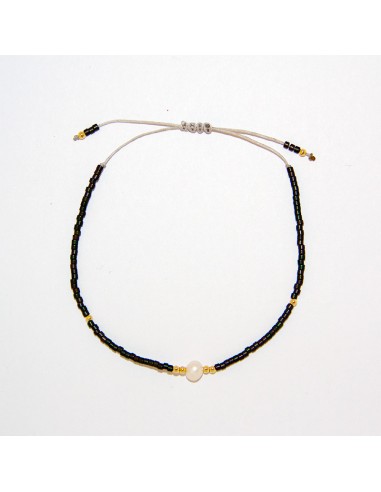 Dieses zarte und feine Armband ist in der Mitte mit einer echten Perlmuttperle geschmückt, die ihrerseits von goldenen Perlen umringt ist, die sie hervorheben. Weitere goldene Perlen zieren elegant den Faden des Armbands und seine Enden wie leuchtende Akzente, die das Ganze erhellen. Der Makramee-Knoten greift die Perlmuttperle auf, und die fliegenden Fäden, die mit vier Perlen verziert sind, sorgen für eine leichte und subtile Note.
