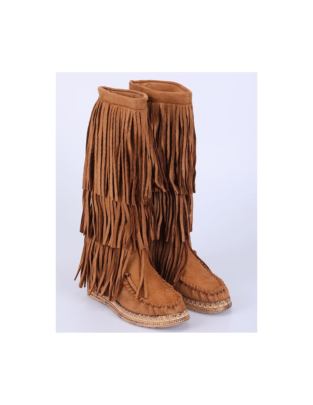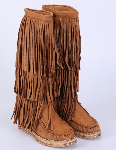 Diese Fransenstiefel sind typisch für den Boho-Stil! Diese Stiefel, die auch Minnetonka genannt werden, stehen zu ihrer Originalität. Sie bestehen aus Kunstleder und sind an der Spitze hübsch mit Schnürsenkeln verziert, die an die Schnürsenkel von Mokassins erinnern. Die Sohle ist mit geometrischen Mustern verziert. Der Stiefel hat einen Absatz, der den Fuß anhebt und im Stiefel versteckt ist.