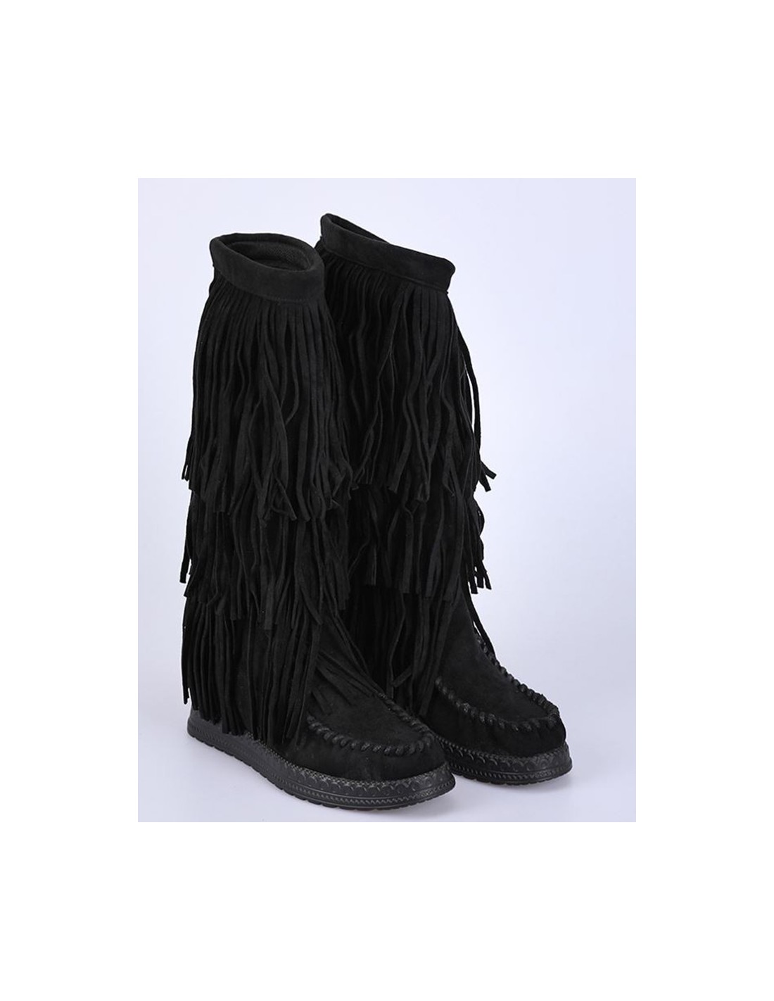 Schwarze Fransenstiefel aus 100% Kunstleder. Diese Minnetonkas haben einen selbstbewussten Bohème-Stil, der perfekt für die Übergangszeit und die kalte Jahreszeit ist! Der Stiefel hat einen Absatz, der den Fuß anhebt und im Stiefel versteckt ist.