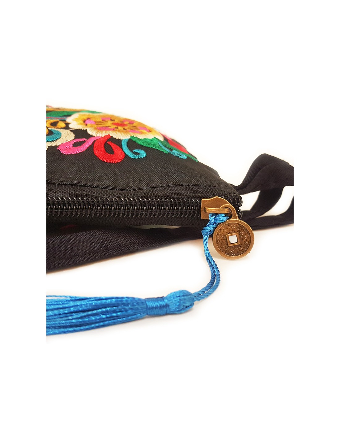 Mit zarten, farbenfrohen Blumenmotiven auf schwarzem Hintergrund bestickte Pochette, die mit einer cyanblauen Quaste verziert ist. Der Reißverschluss ist in Form einer durchlöcherten Münze wie ein Yen gestaltet.