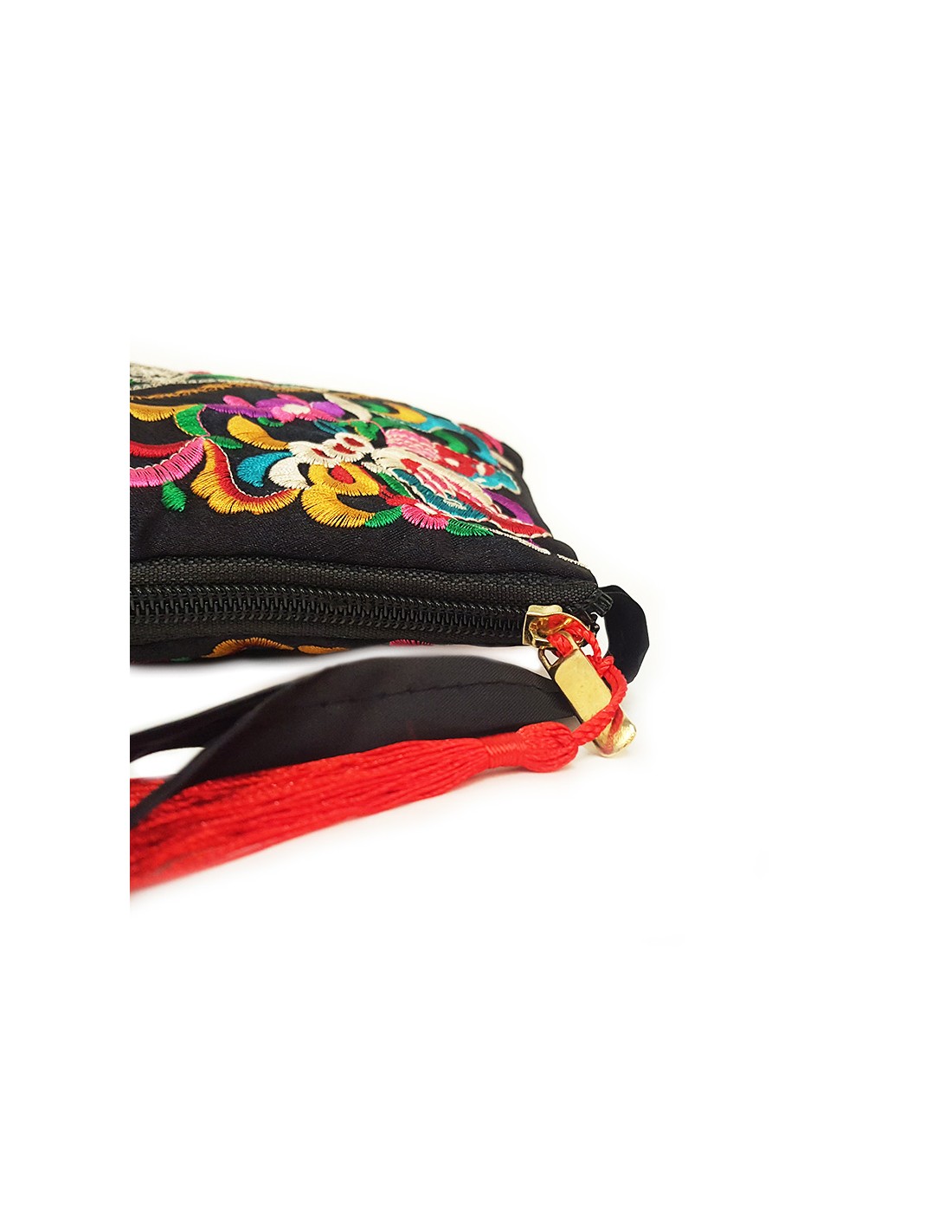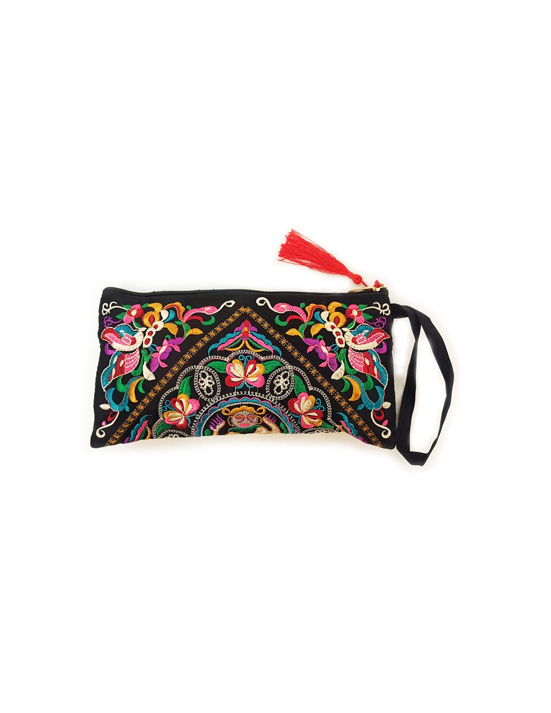 Das Täschchen ist mit einem glückbringenden Gesichtsmotiv und floralen und bunten Verzierungen auf schwarzem Hintergrund bestickt und mit einer roten Quaste verziert. Der Reißverschluss ist länglich und vergoldet.