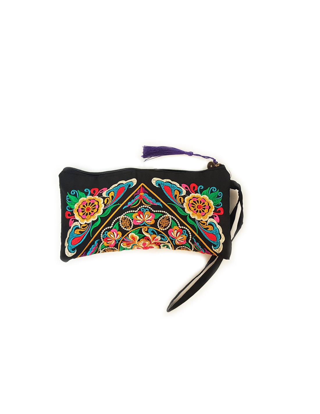 Die mit zarten, farbenfrohen Blumenmotiven bestickte Clutch auf schwarzem Hintergrund ist mit einer lilafarbenen Quaste verziert. Der Reißverschluss ist in Form einer durchlöcherten Münze wie ein Yen gestaltet.