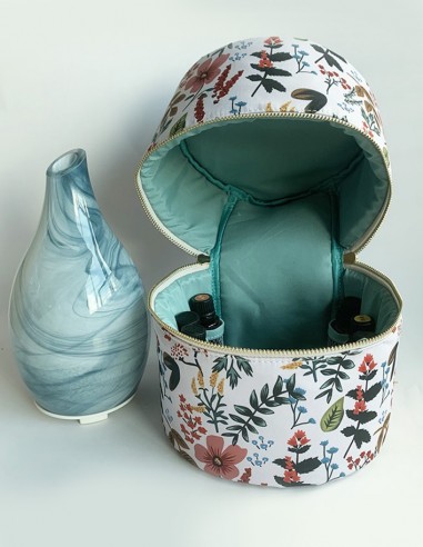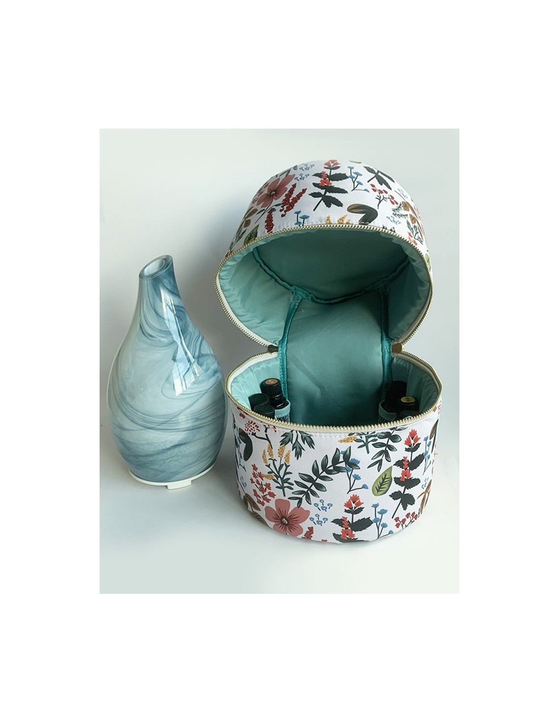 Aufbewahrungstasche für einen Diffusor und Flaschen mit ätherischen Ölen, mit hübschen, zarten und farbenfrohen Blumenmustern und mit einem Henkel zum Tragen.