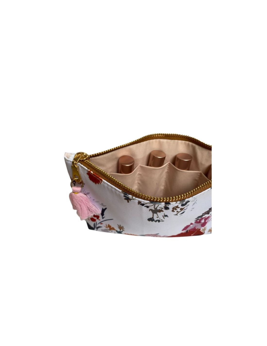 Aufbewahrungstasche für Flaschen mit ätherischen Ölen, mit hübschen, zarten und farbenfrohen Blumenmotiven und verziert mit einer kleinen rosa Pompon, mit Reißverschluss.