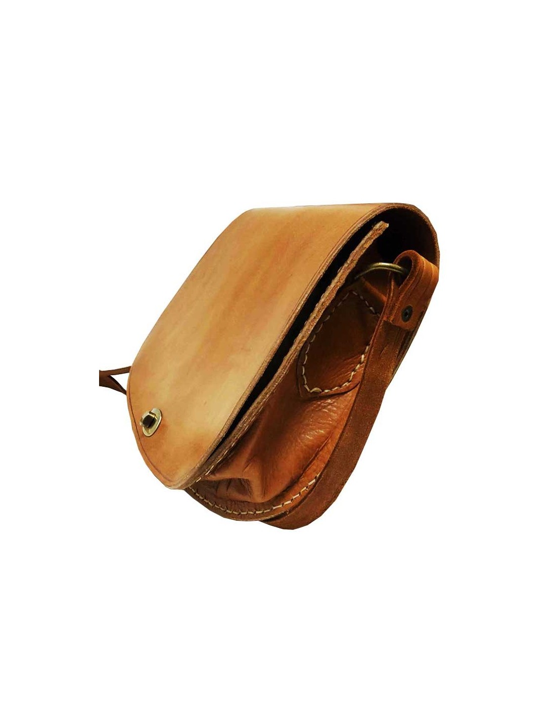 Diese Umhängetasche aus Leder wurde von Kunsthandwerkern vollständig von Hand verarbeitet. Das Leder dieser Tasche ist dick und robust. Ein bronzefarbener Metallverschluss sorgt dafür, dass die Tasche sicher verschlossen bleibt. Wenn sie geöffnet wird, bietet eine große Tasche in der Mitte Platz für alles Notwendige und eine Reißverschlusstasche auf der Vorderseite Platz für das Wichtigste.