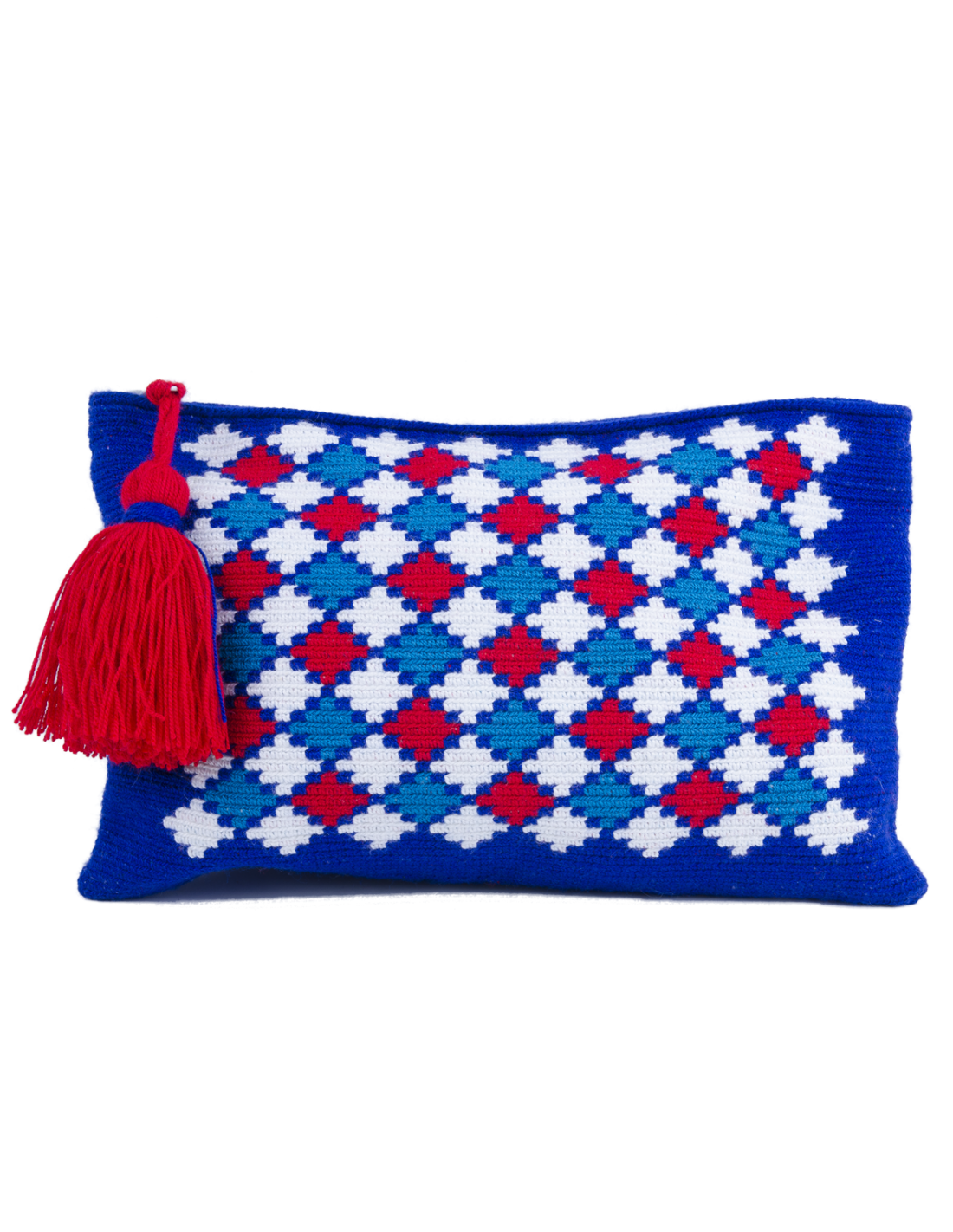 Mochila Wayuu-Beutel, gewebt mit einem feinen Netz und sehr bunten ethnischen Mustern in Blau, Rot und Weiß. Diese Tasche hat einen Reißverschluss und einen Pompon. Diese Tasche ist komplett handgefertigt.
